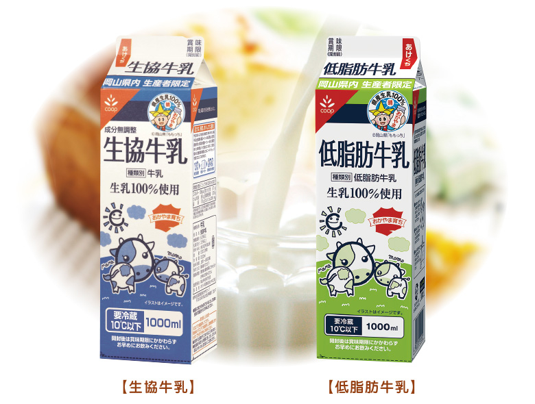 生協牛乳・低脂肪牛乳ともに、岡山県内の生産者を指定。最新の設備で乳牛を大切に育てています。加工するメーカーも生協牛乳は岡山市にある「オハヨー乳業(株)」、低脂肪牛乳は倉敷市にある「タカナシ乳業(株)」を指定しています。生産者・メーカーともに地元岡山県であるため、原料は産地から直接メーカーへ送られ、いつでも鮮度を保ったままおいしい牛乳をお届けすることが可能です。