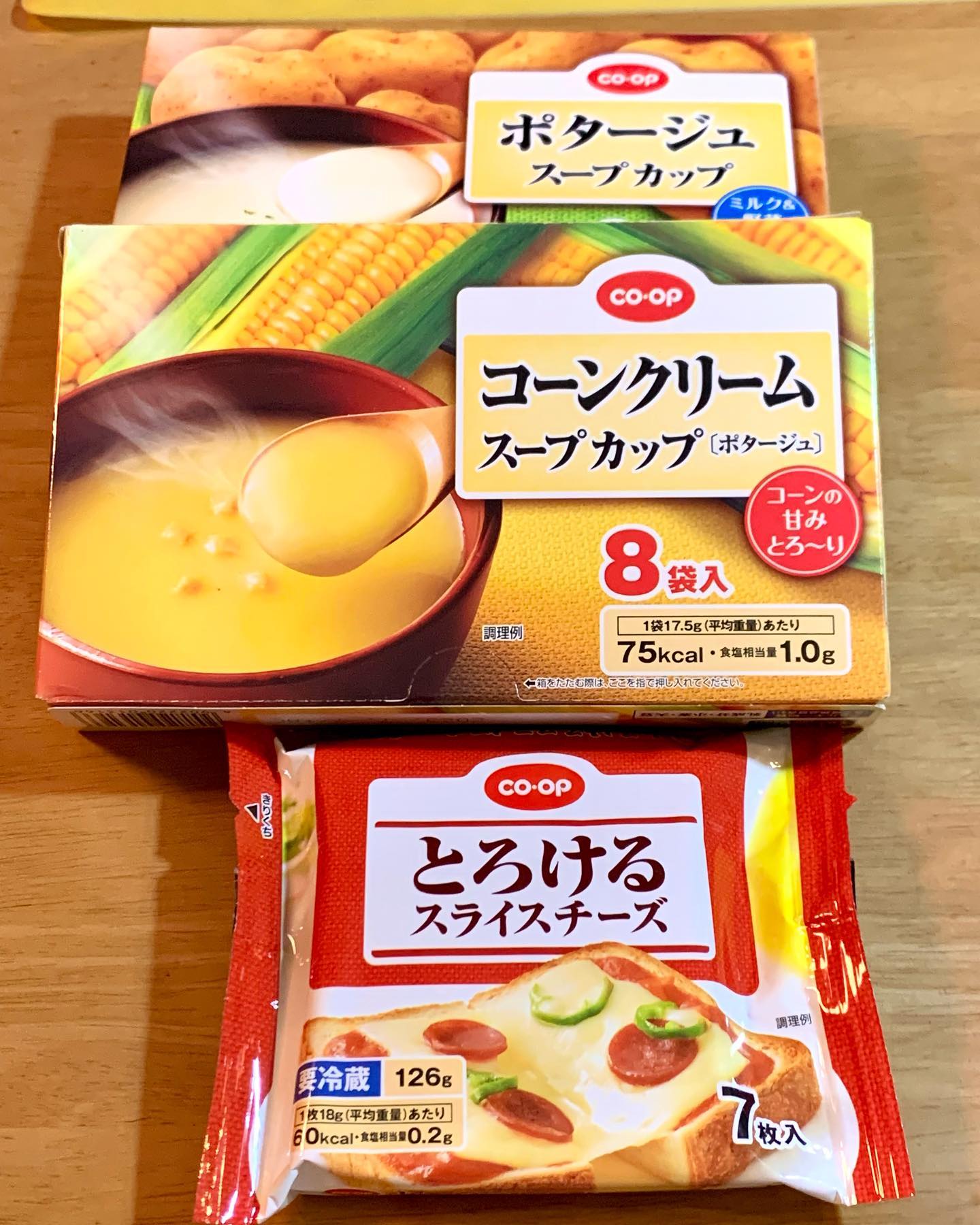 今日のお昼ごはん ☆ピザトースト ☆ポテトサラダ ☆タン塩ハム ☆スクランブルエッグ 寒いのでコープさんのスープカッの好きな方を作って飲む方式 主人はコーンクリームで、長女と私はポタージュ☺️ それからこのとろけるスライスも美味しいよ(*´ч`*) ピザトーストにピッタリ✌️ #お昼ごはん #コープ #スープカップ #コーンクリーム #ポタージュ #cコレ商品のある風景 #とろけるスライスチーズ #ピザトースト