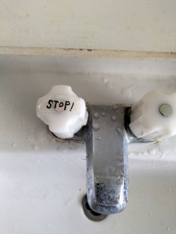 無意識のうちに「お湯」の蛇口をひねる家族のために、蛇口の上に「stop」と書いたテープを貼って、資源の無駄遣いを意識してもらう