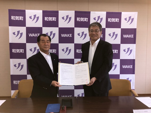 和気町役場で行われた調印式では、おかやまコープ 平田昌三理事長と和気町 草加信義町長が協定書に署名しました。