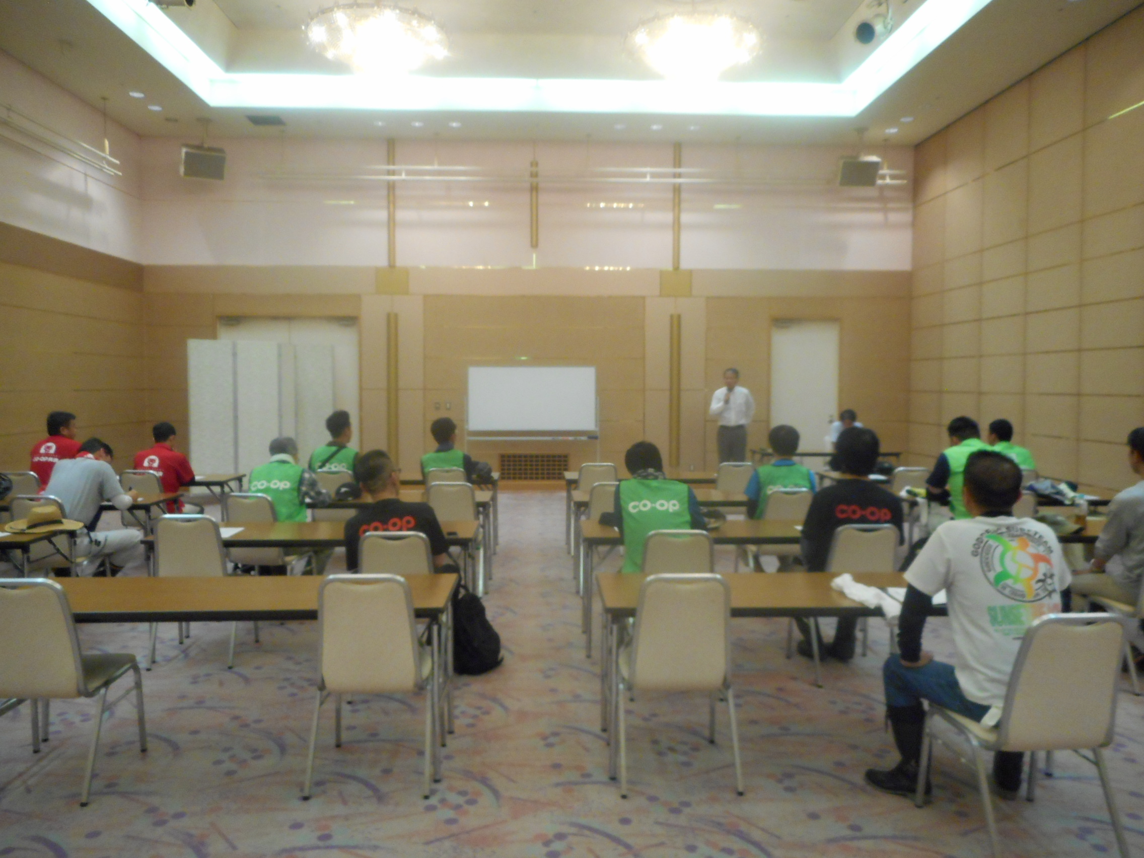 17日8時からサントピア岡山総社にて出発式を行いました。平田理事長からは「未曾有の暑さ、未曾有の被害、こんな経験は今までにありません。連帯の中で迅速に集まっていただいたことに感謝します。地域の皆さんを支援することで前向きな気持ちになってもらえると思いますので、まずはご自身の安全を確保して頑張ってください」と挨拶がありました。