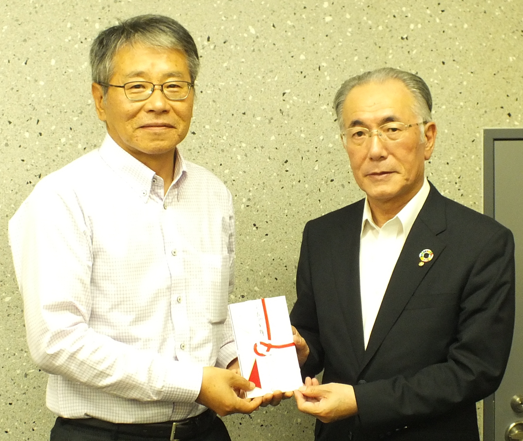 生協くまもと吉永理事長(右)から災害御見舞を受け取る平田理事長