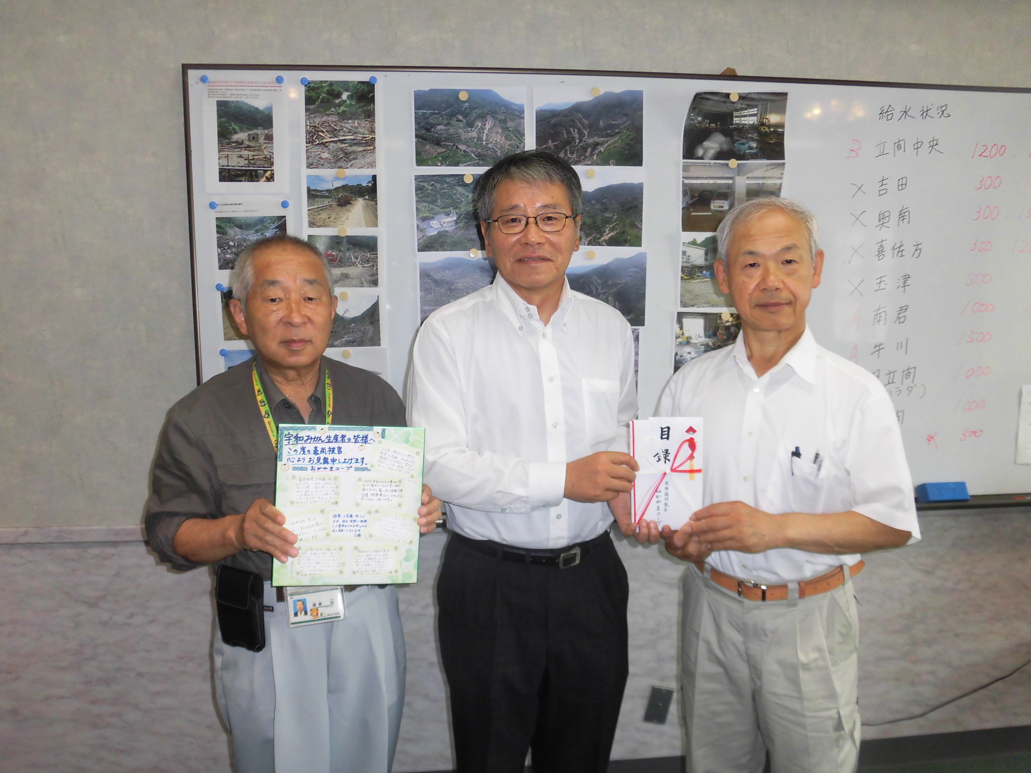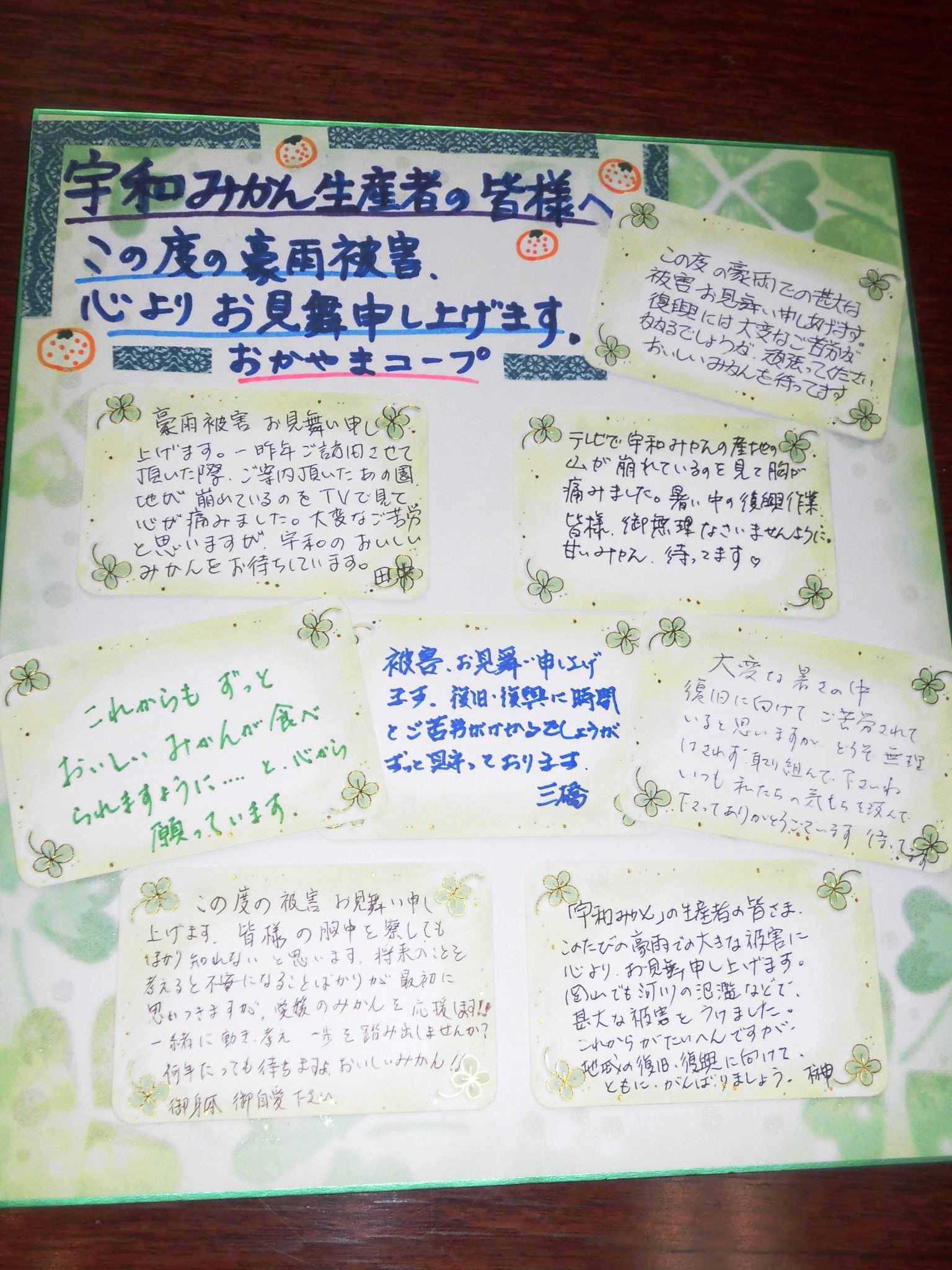 黒田組合長からは、「岡山県も同じ被災地でご苦労なさっている中、わざわざ宇和までお越しいただきうれしく思います。組合員さんからの温かい応援メッセージは、大変ありがたく感謝いたします」とお礼が伝えられました。