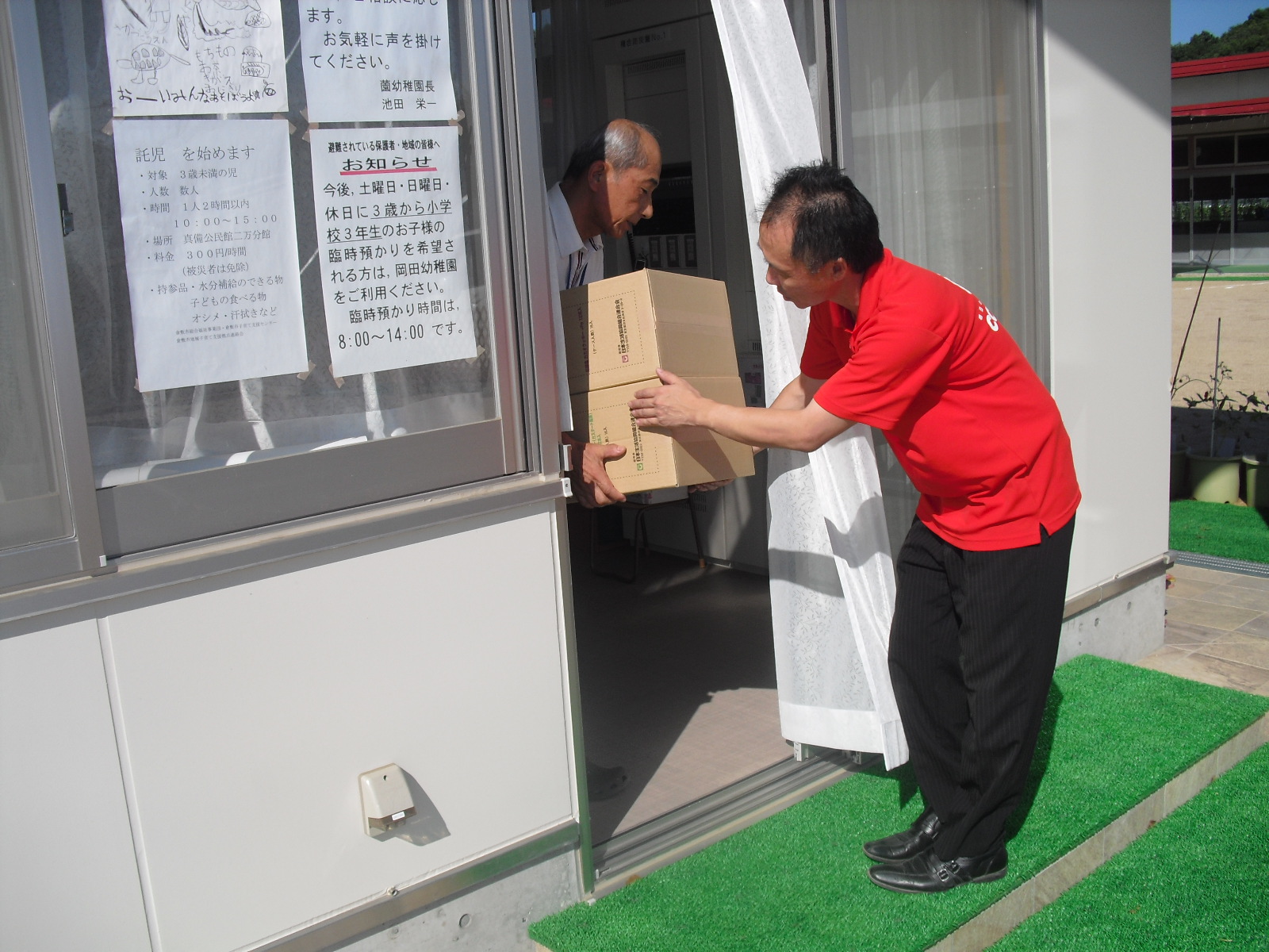 倉敷市立薗(その)幼稚園にお菓子をお届けする堀本センター長(右)