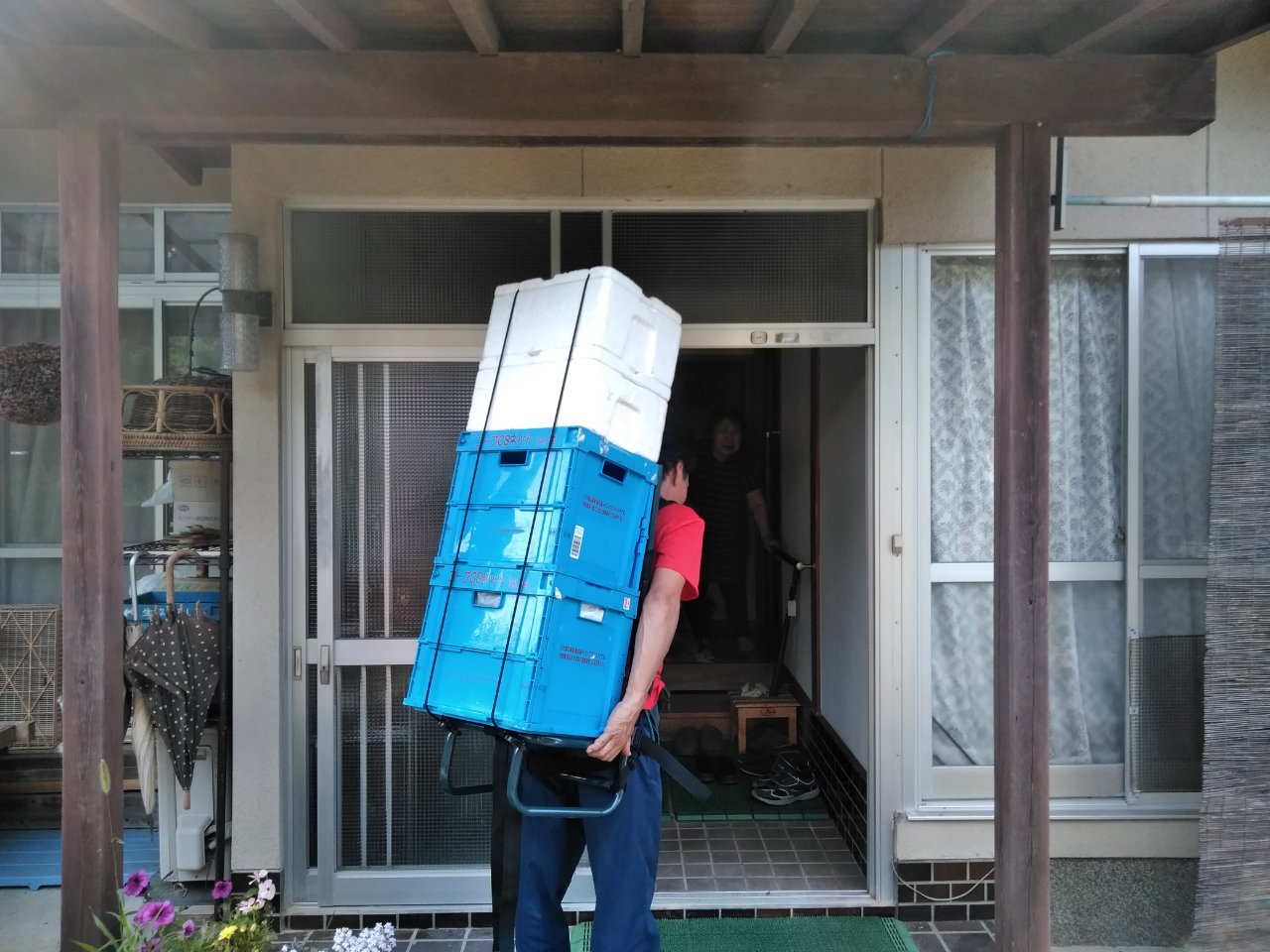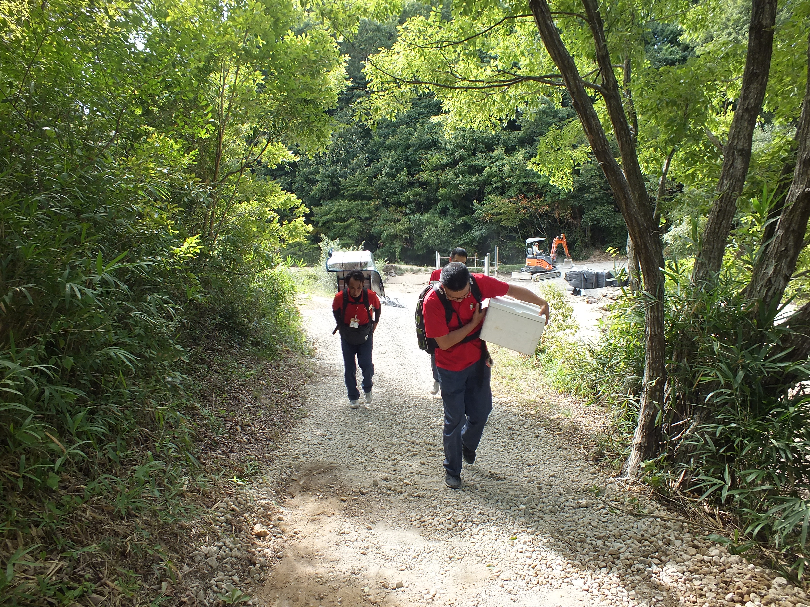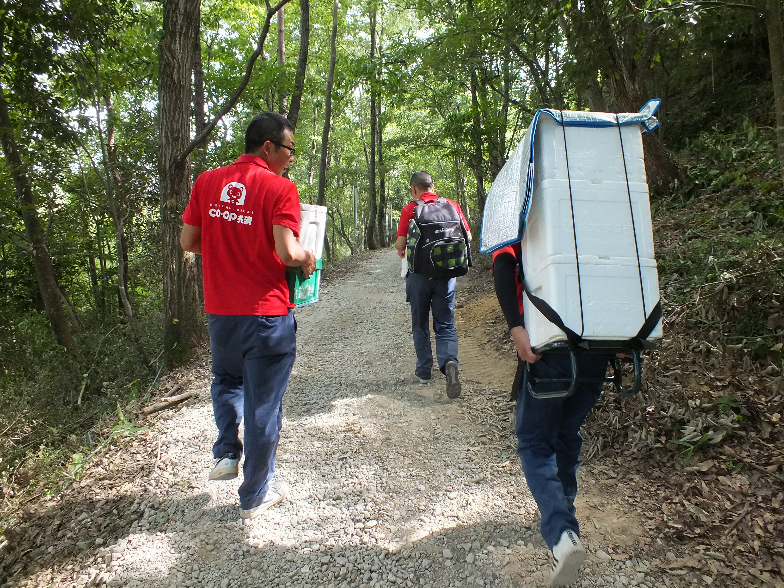 おかやまコープ津高センターの配送エリアには、西日本豪雨で道路の陥没により孤立した地区があります。(岡山市北区菅野)トラックで通れる道が通行止めになってしまったため、配送担当職員が商品を背負子(しょいこ)で担ぎ、裏山から約400mを徒歩で運んでいます。