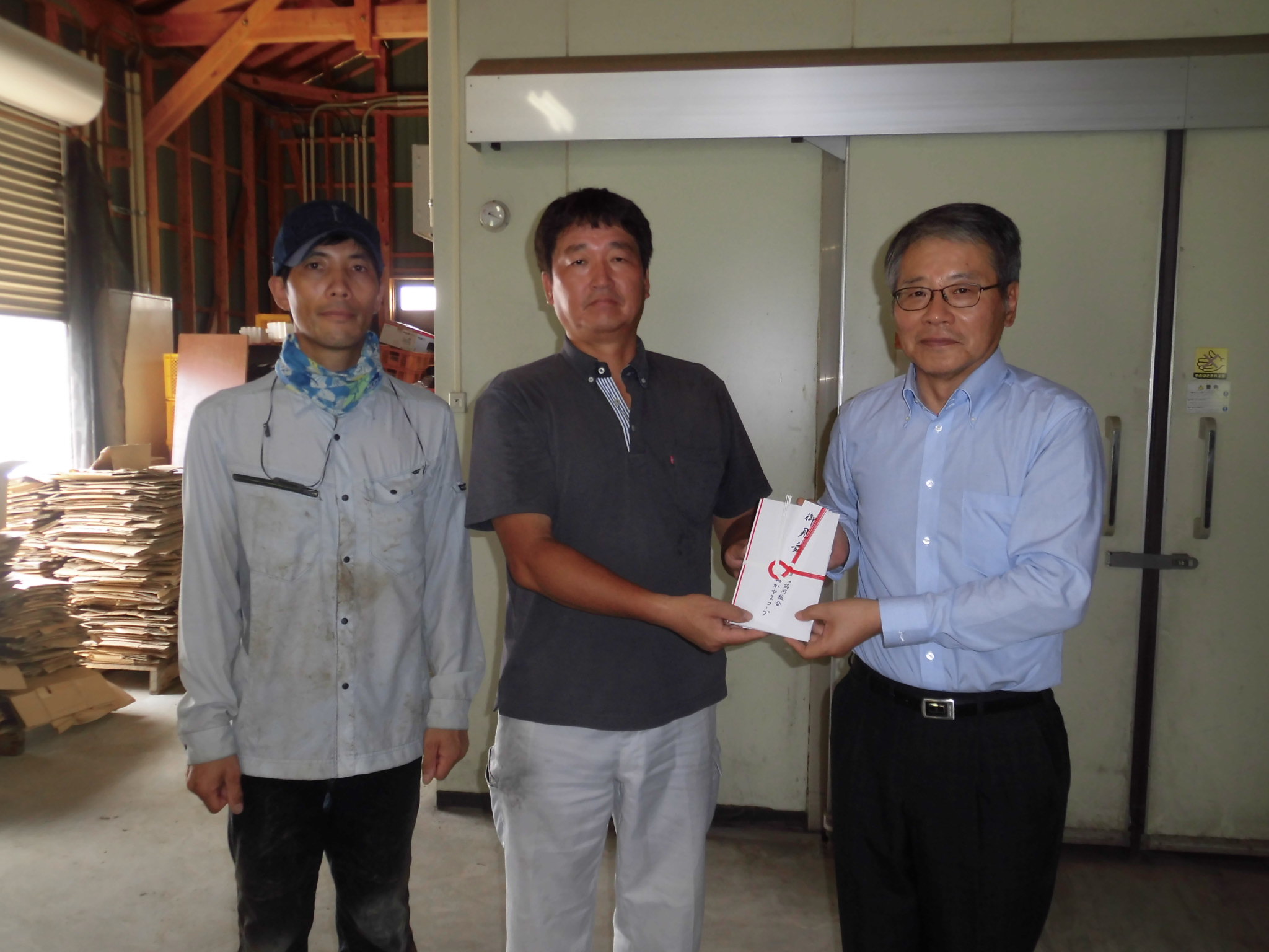 林社長(中央)へ、平田理事長よりお見舞いをお渡ししました。