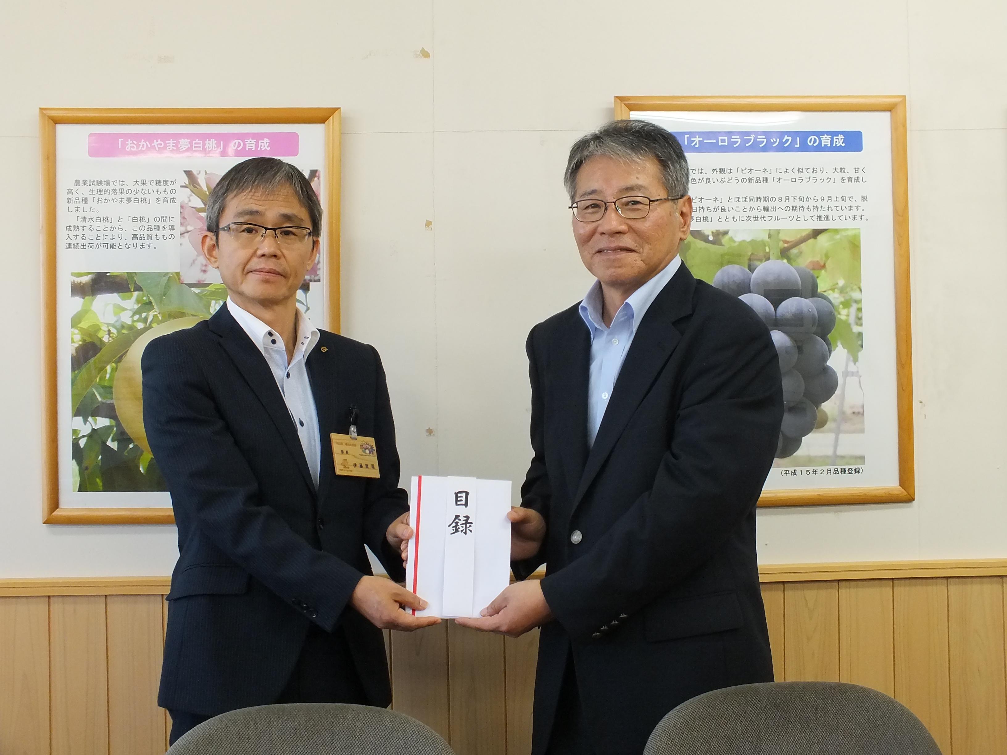 伊藤農林水産部長から「岡山県の農林水産業は約196億円(8月13日時点)の被害を受けています。この寄付金は被災した農業用ハウスや農業用機械等の修繕支援の財源に充てさせていただきます。」とお礼が伝えられました。