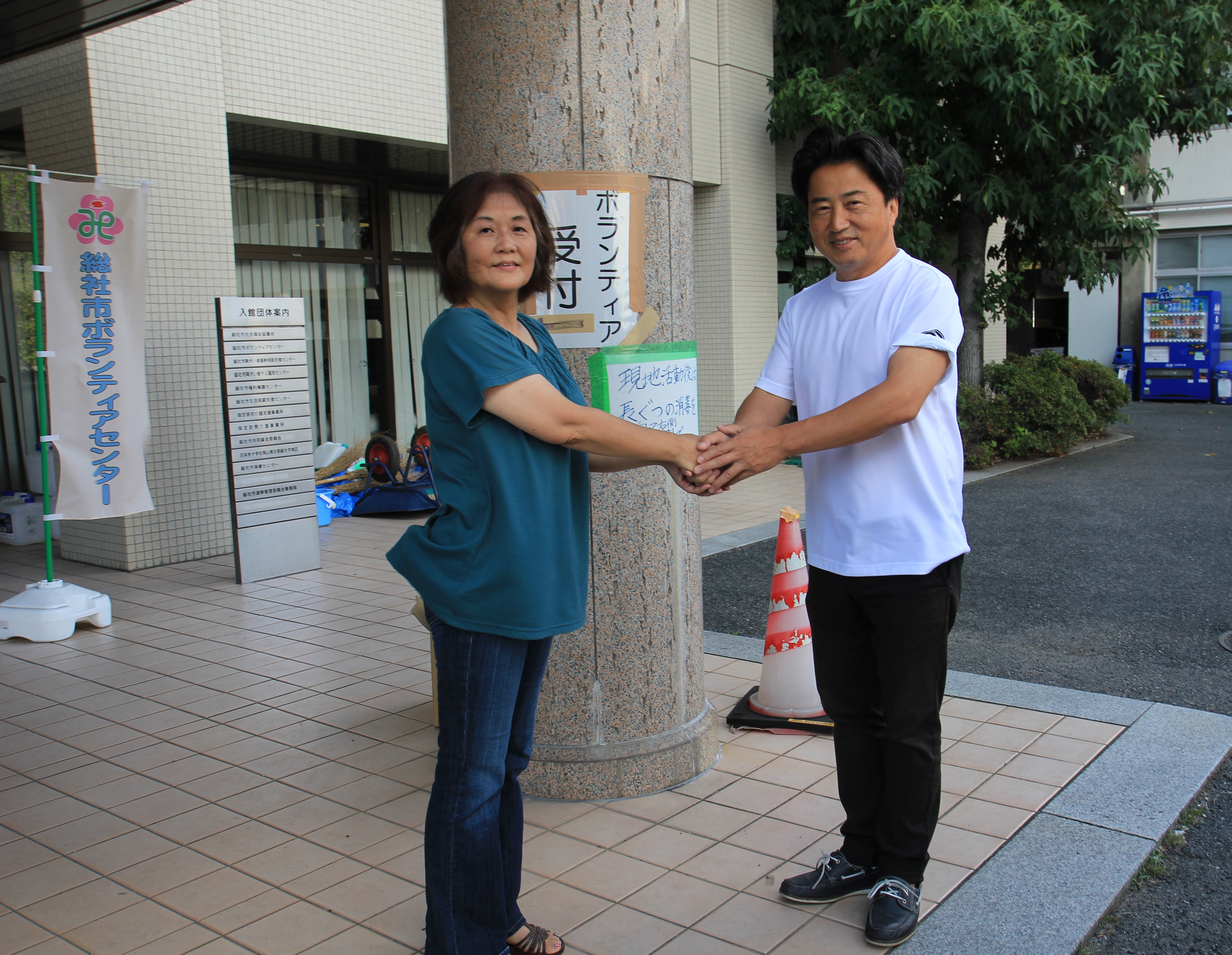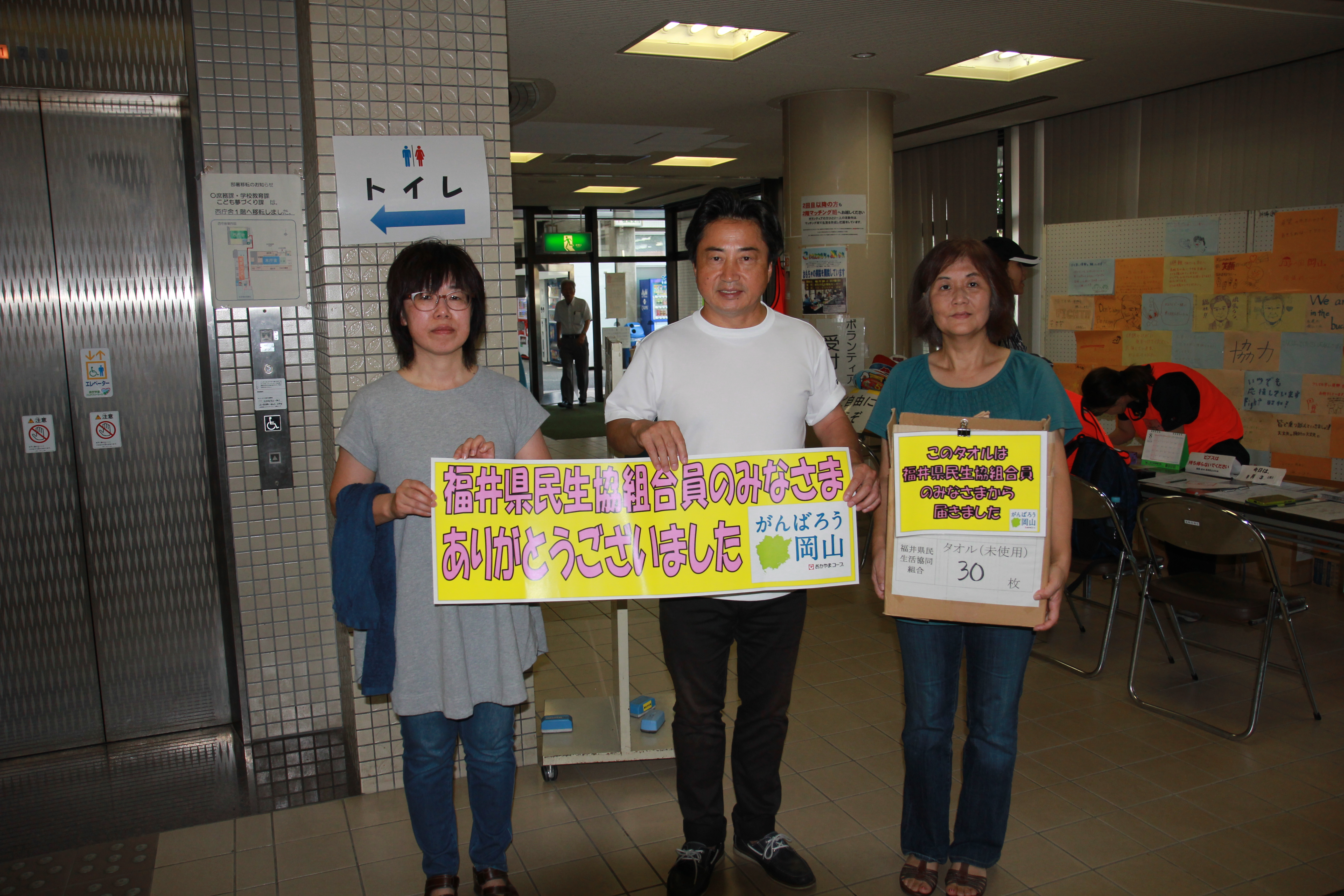 片岡市長からは、「発災後2ヵ月間、フリーマーケットという形で避難所の方々に物資を提供してきましたが、報道などが減り、徐々に災害が風化する中、物資不足で困っていました。新品のタオルが欲しいと思っていたところ、願いが叶って、福井県民生協の皆さんから2,800枚もタオルを届けていただき、本当にありがたく思っています。総社市はもとより、まだまだ困っている方々にこれからも引き続き支援をよろしくお願いします」と感謝のことばが伝えられました。