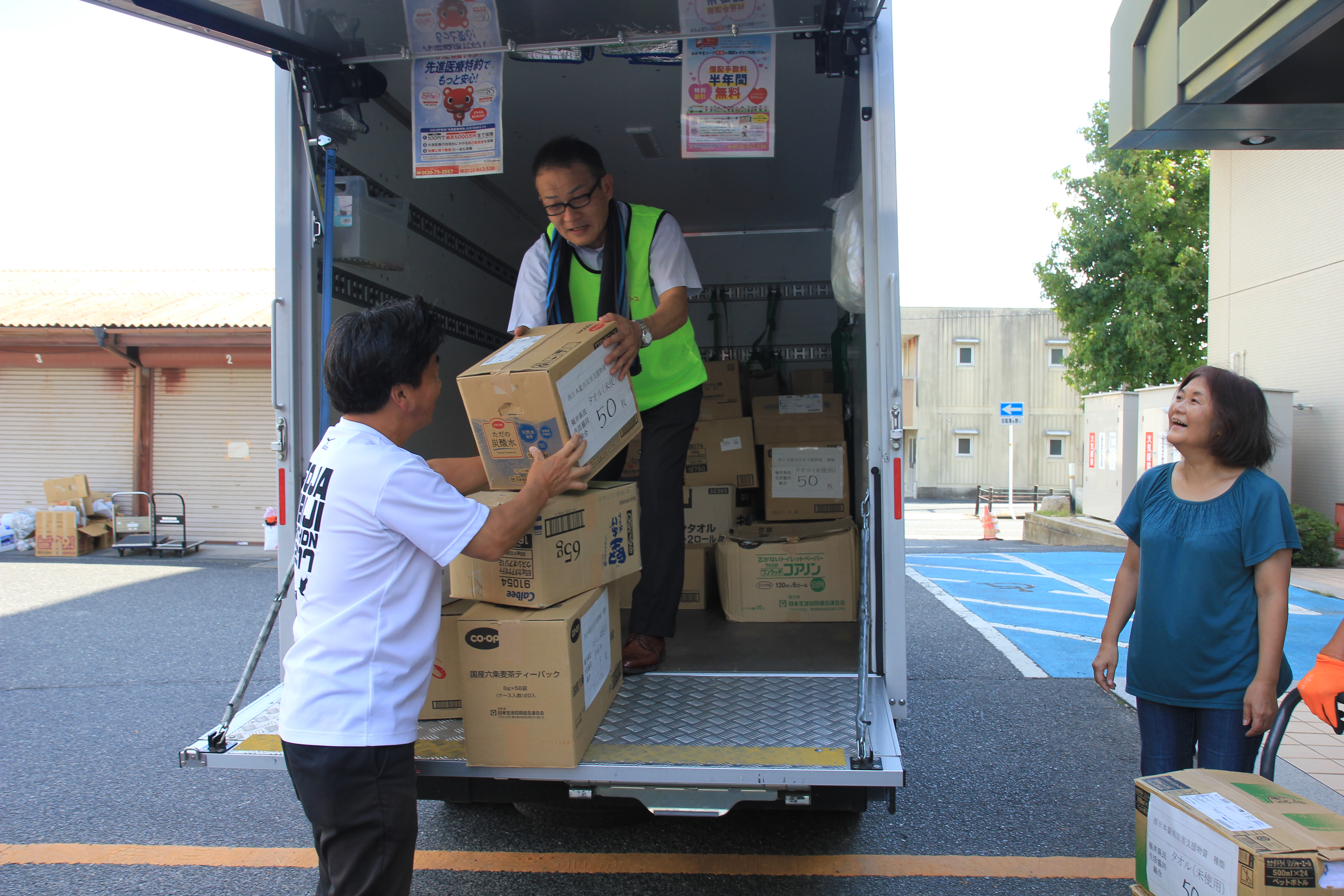 ダンボール52箱に入ったタオルを生協トラックでお届け