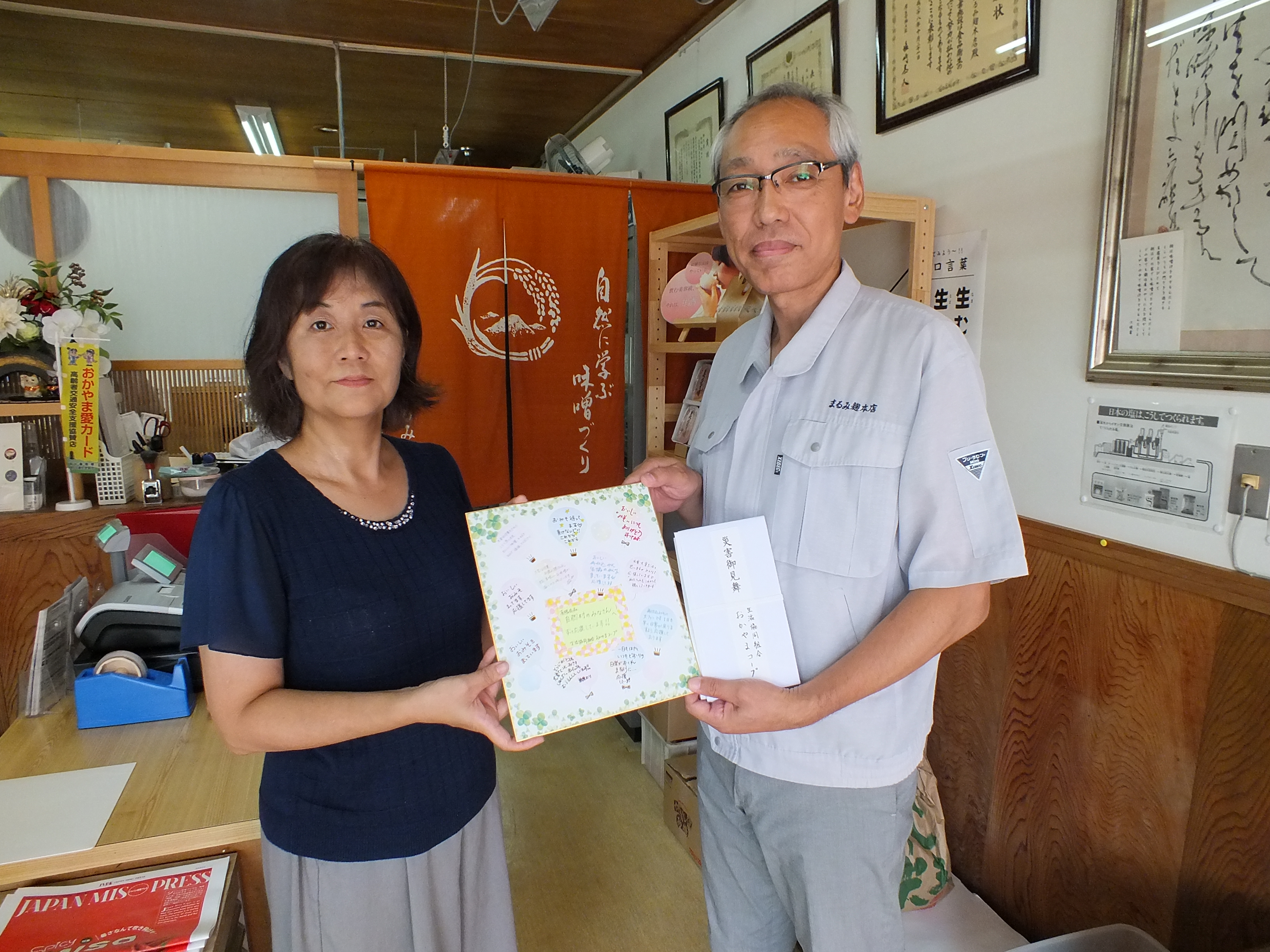 9月7日(金)、おかやまコープ東裕子エリア理事ら2名が、このたびの豪雨災害により被害を受けた(有)自然村(総社市美袋)を訪問しました。おかやまコープには「再仕込みみそ」を供給していただいています。今回の災害で約1m浸水しましたが、懸命な復旧作業により約10日で製造再開し、現在通常どおり営業できているそうです。