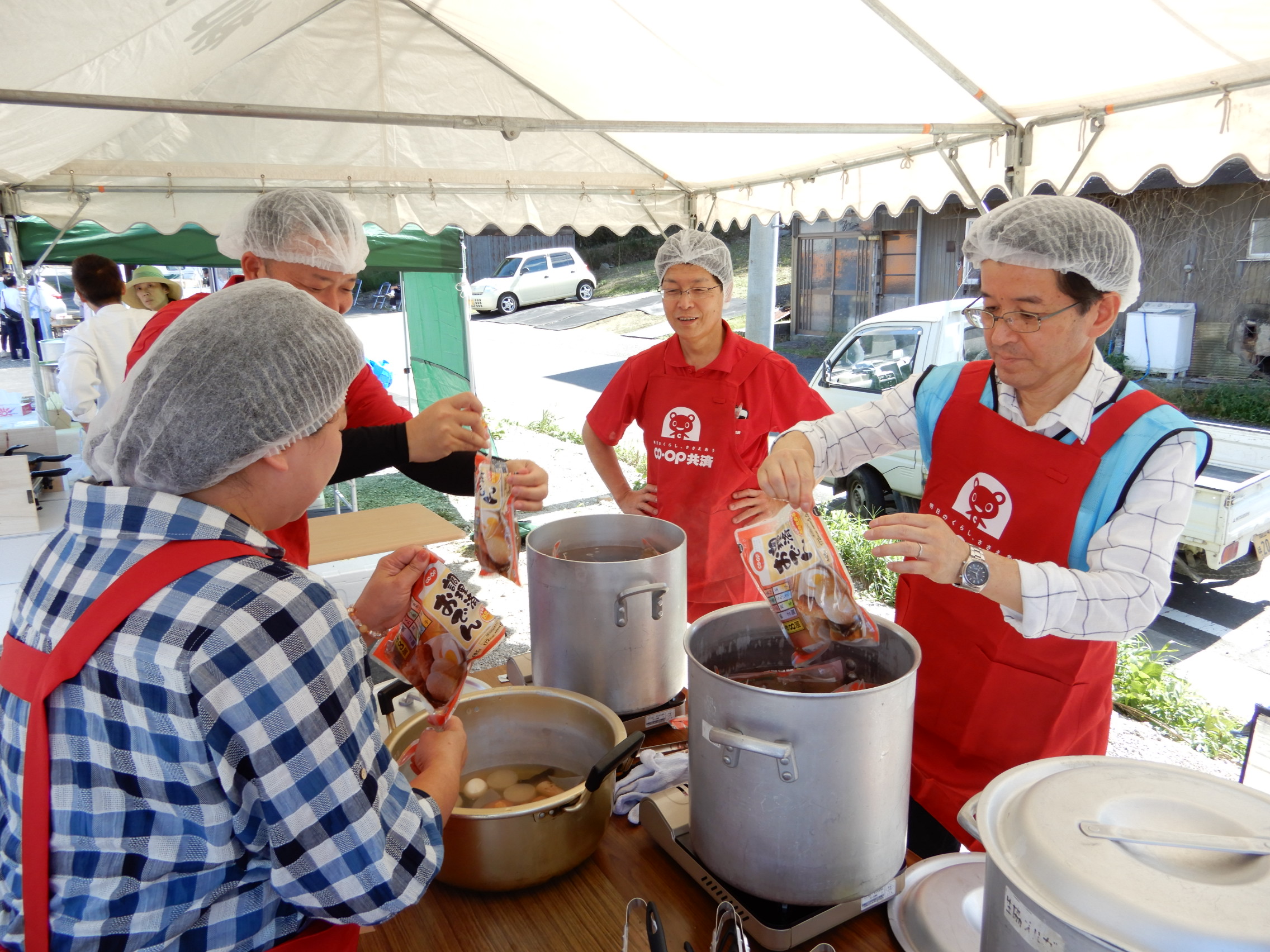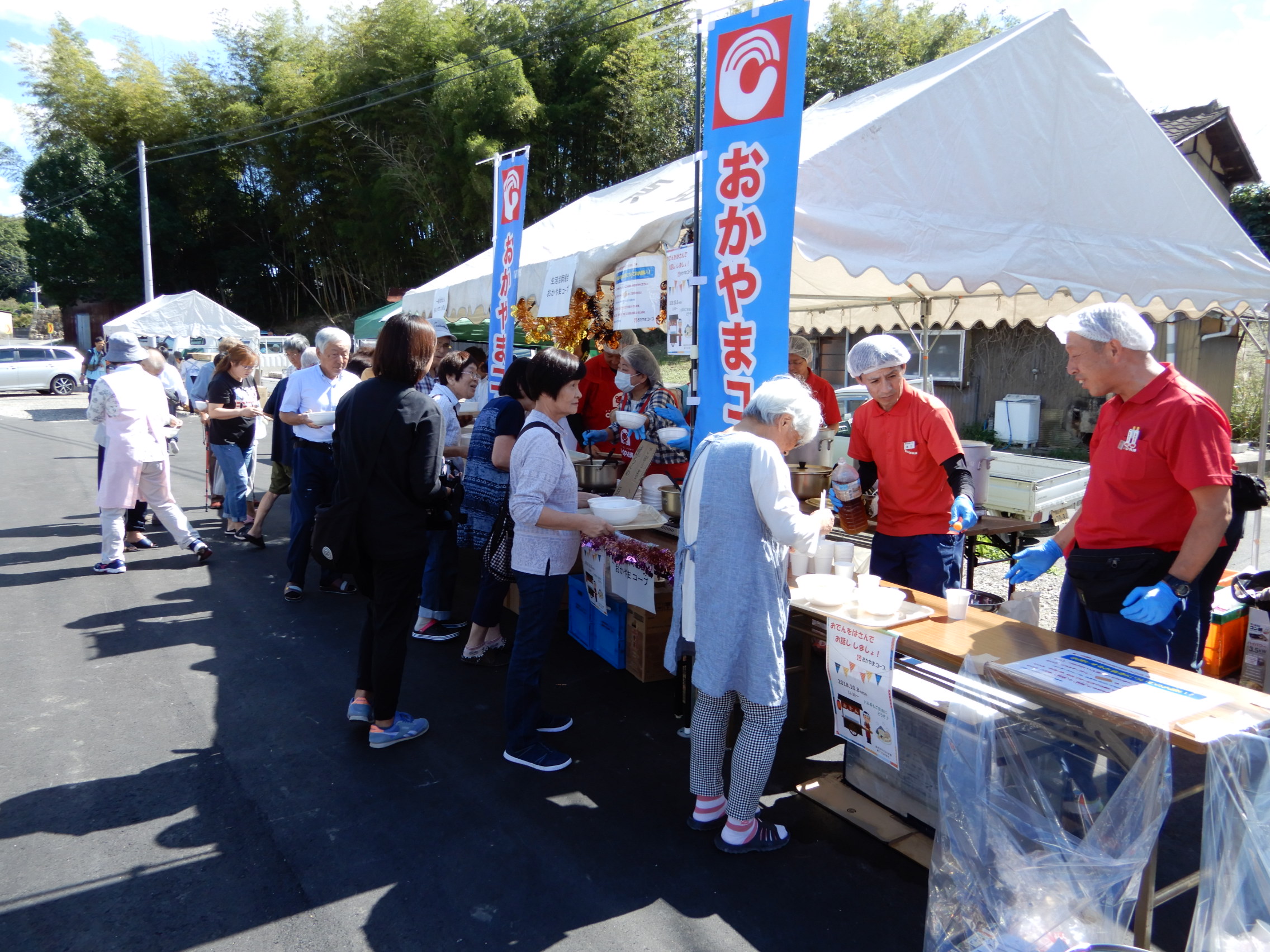当日は、暑いぐらいの陽気となりましたが、仮設住宅に入居されている約100名の方々にコープ商品の「調理済おでん」やお菓子などを振る舞いました。