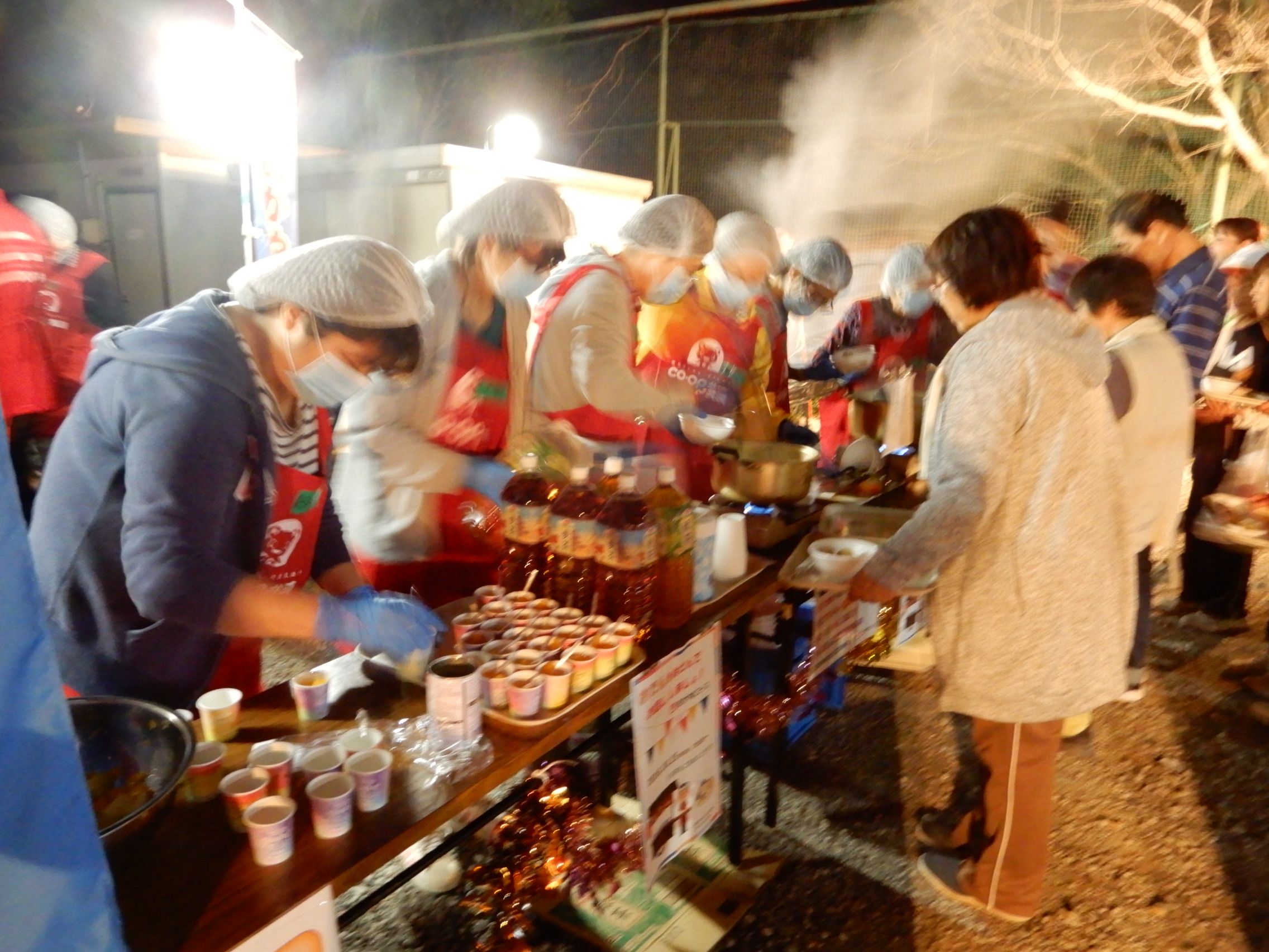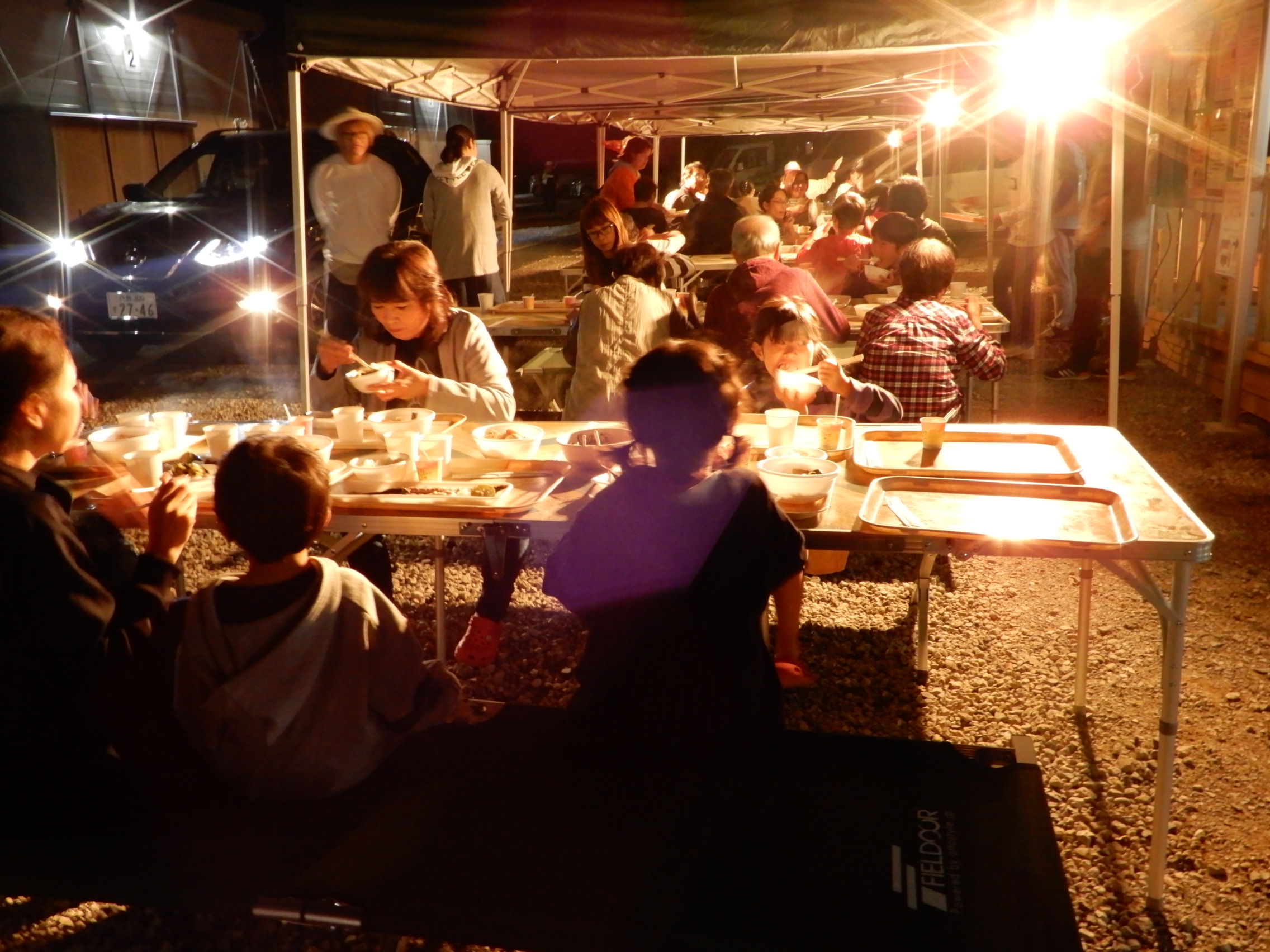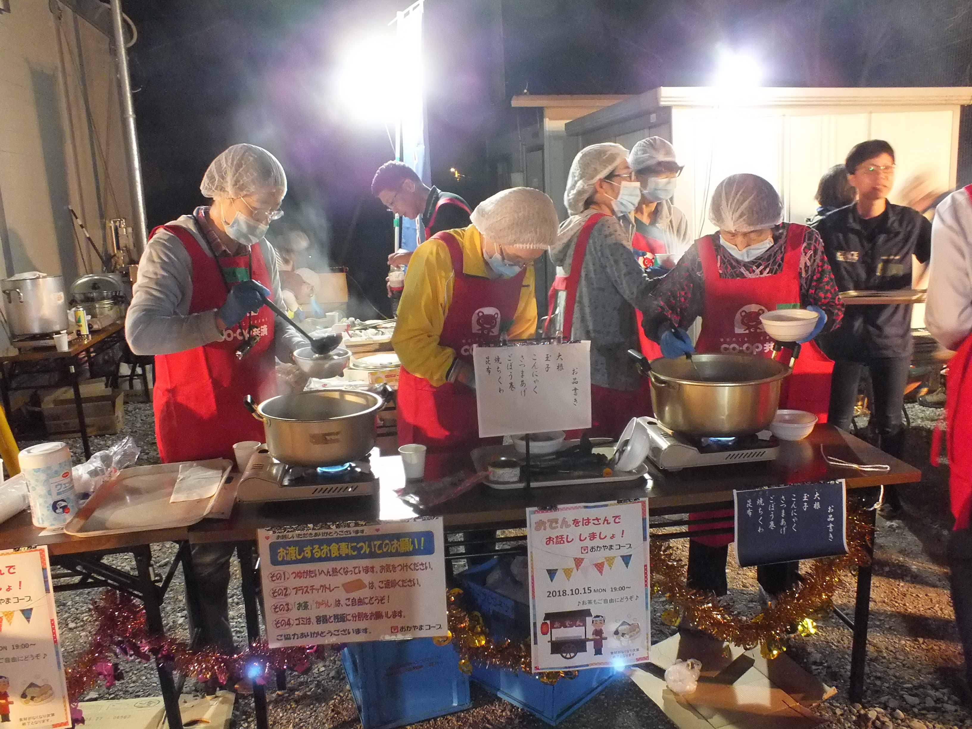 19時からの「夕食交流会」では、おかやまコープがおでんやデザート、ピースボートが石巻から直送されたサンマの塩焼などを提供しました。子どもの参加も多く、家族で食事をする姿や、発災後から真備町でボランティア活動をしながら各地のイベントで歌っている横浜出身のデュオボーカルユニットが歌を披露するなど、会場は和やかな雰囲気に包まれました。