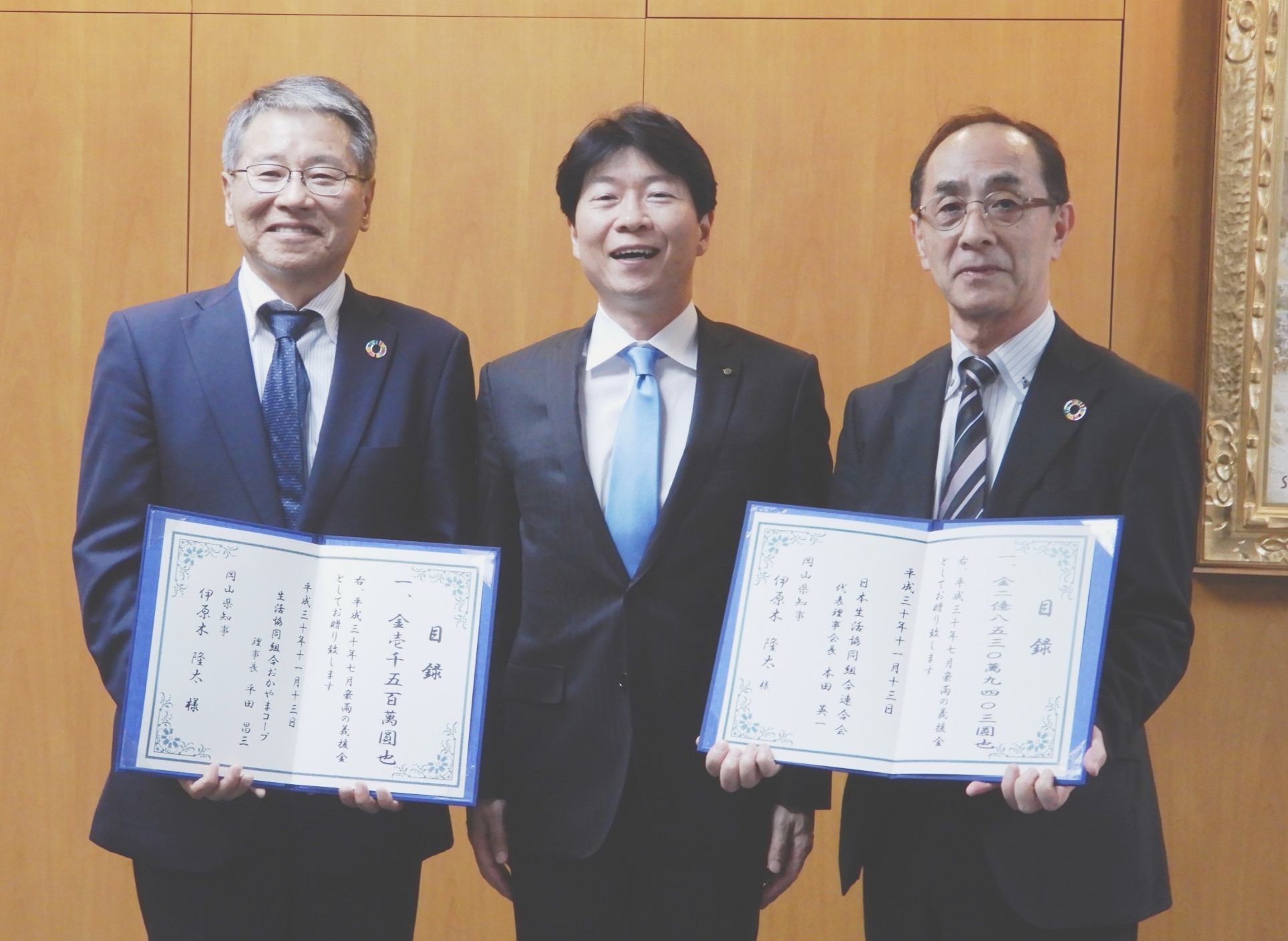 11月13日(火)、岡山県庁知事室で行われた贈呈式には、伊原木隆太県知事、日本生協連 本田英一会長とおかやまコープ 平田昌三理事長が出席し、日本生協連からの2億8,530万9,403円におかやまコープの組合員から寄せられた1,500万円を合わせた総額3億30万9,403円を贈呈しました。
