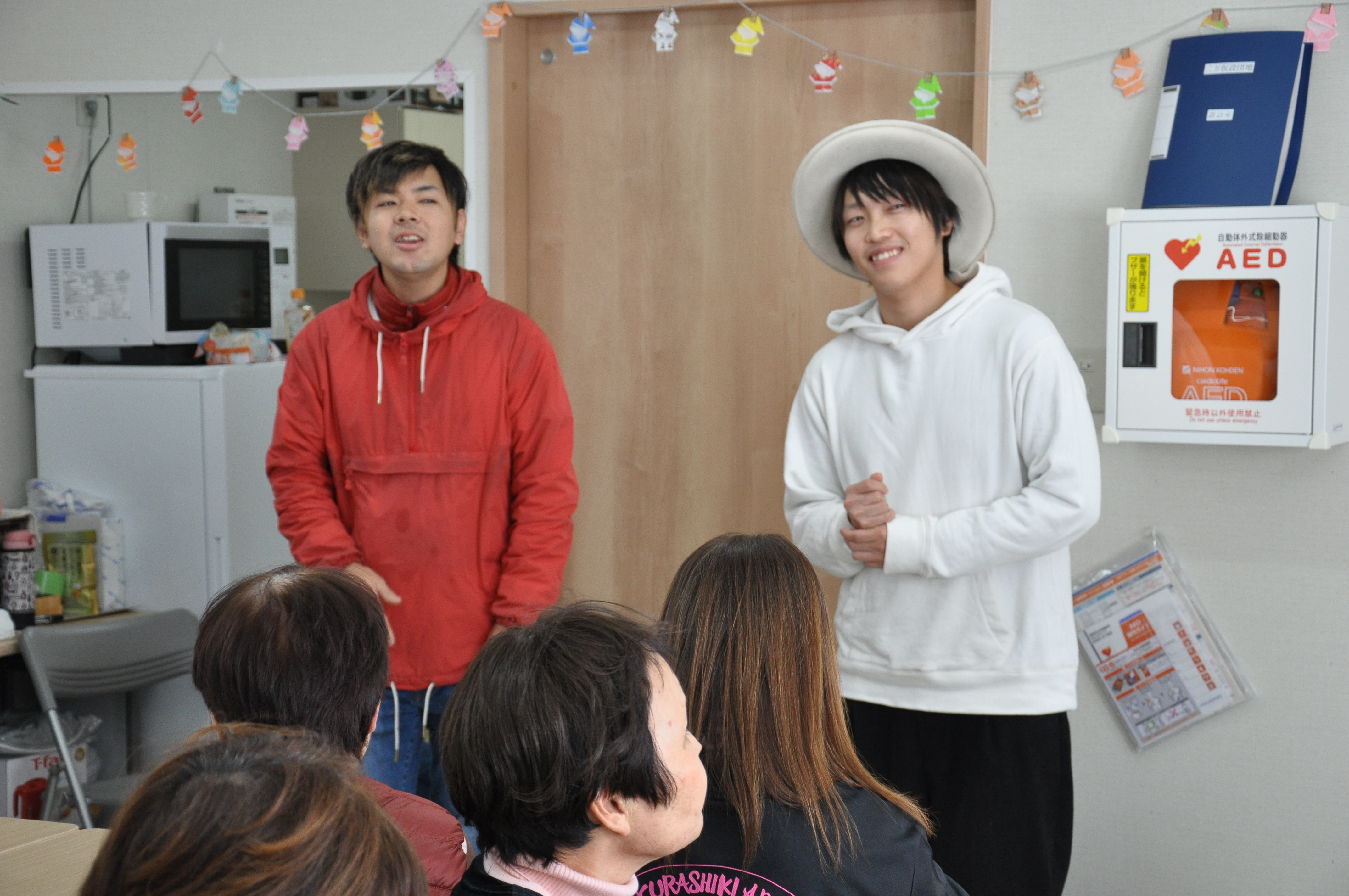 このサロンは、仮設住宅で暮らしている住民同士、また仮設を離れた方や地域住民との交流を目的としており、おかやまコープ組合員が倉敷市社会福祉協議会に「被災地のために何かできないか」と相談、連携しながら月1回開催しています。