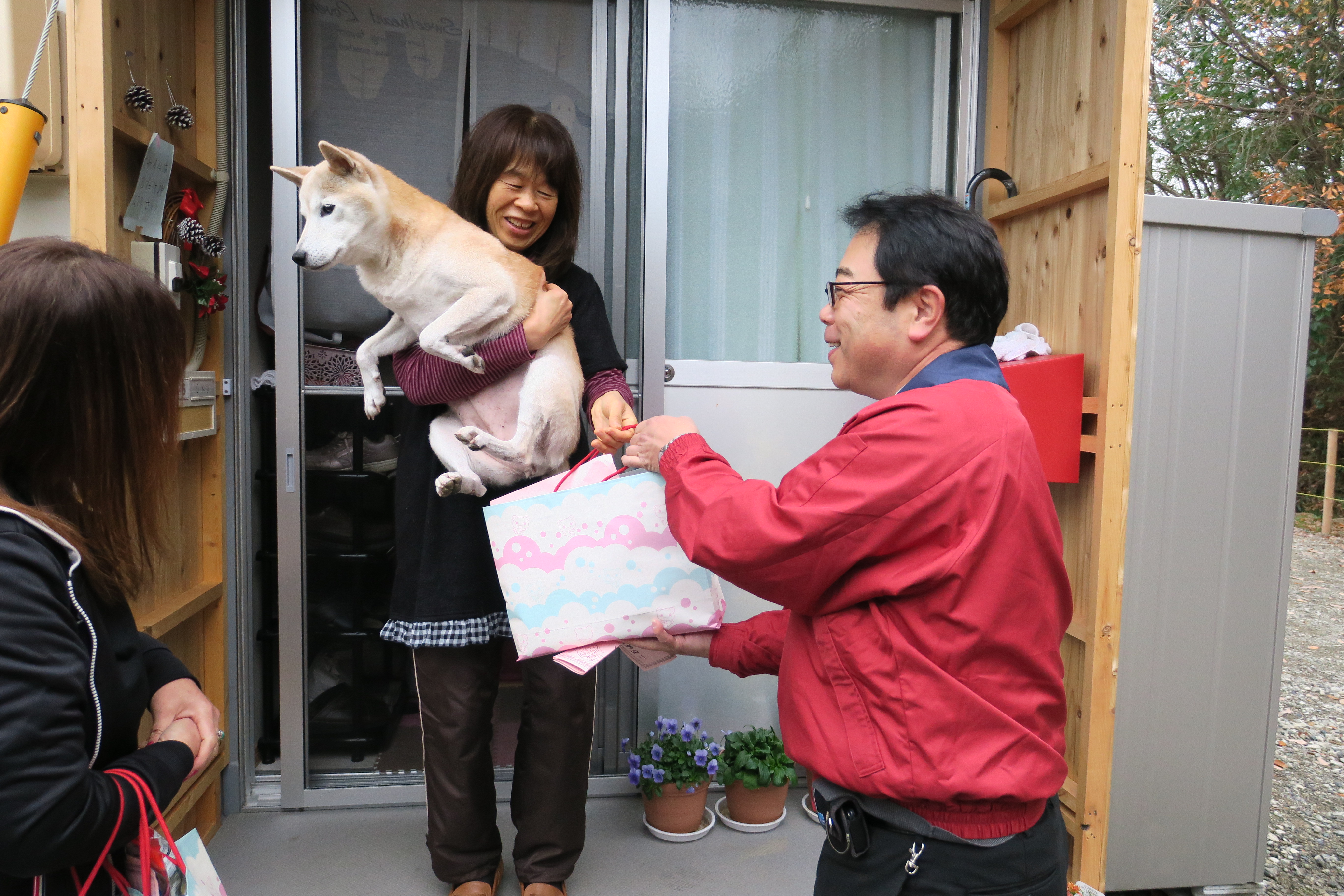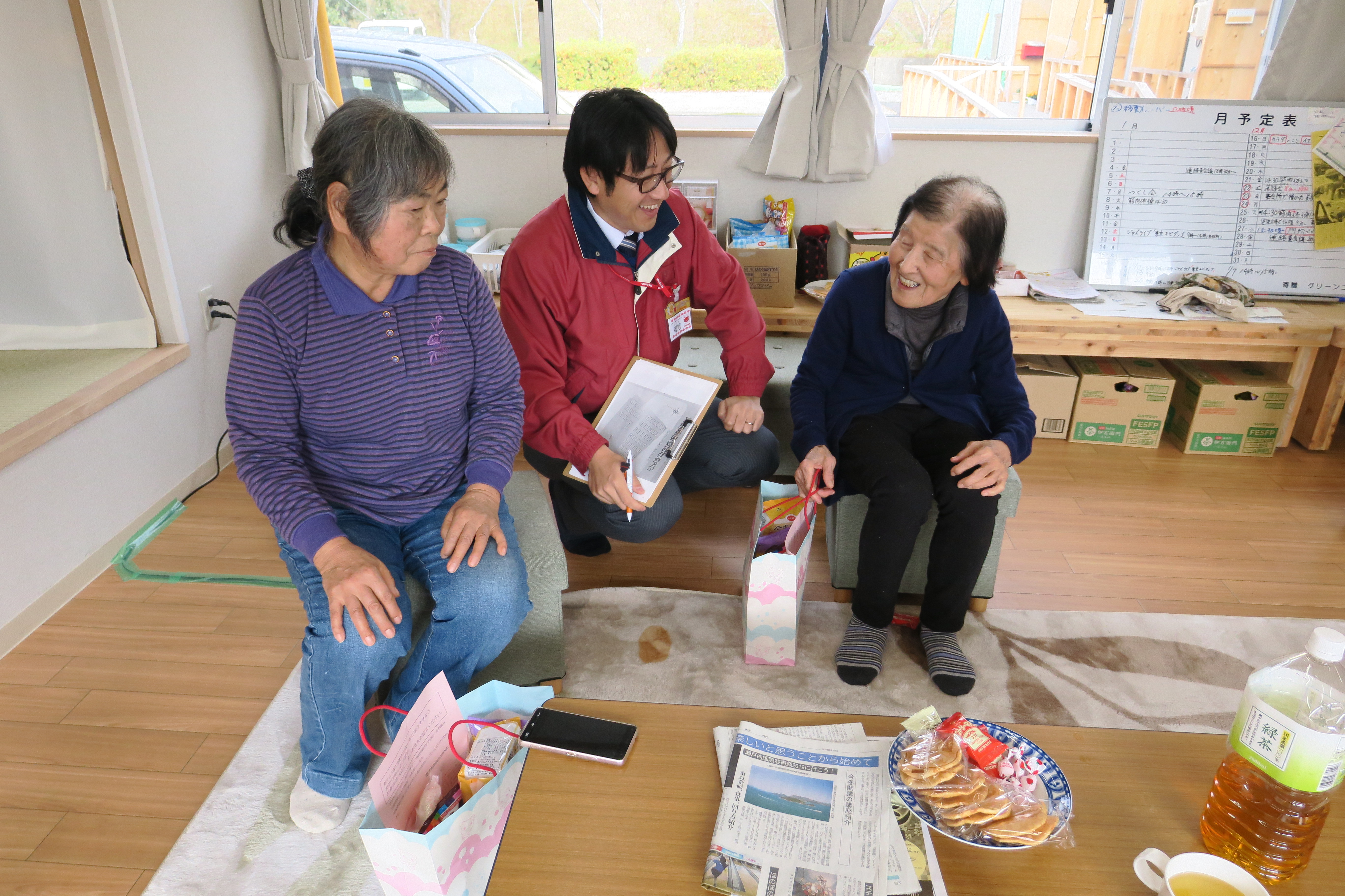 笑顔で商品を受け取る住民の方(二万仮設団地)
