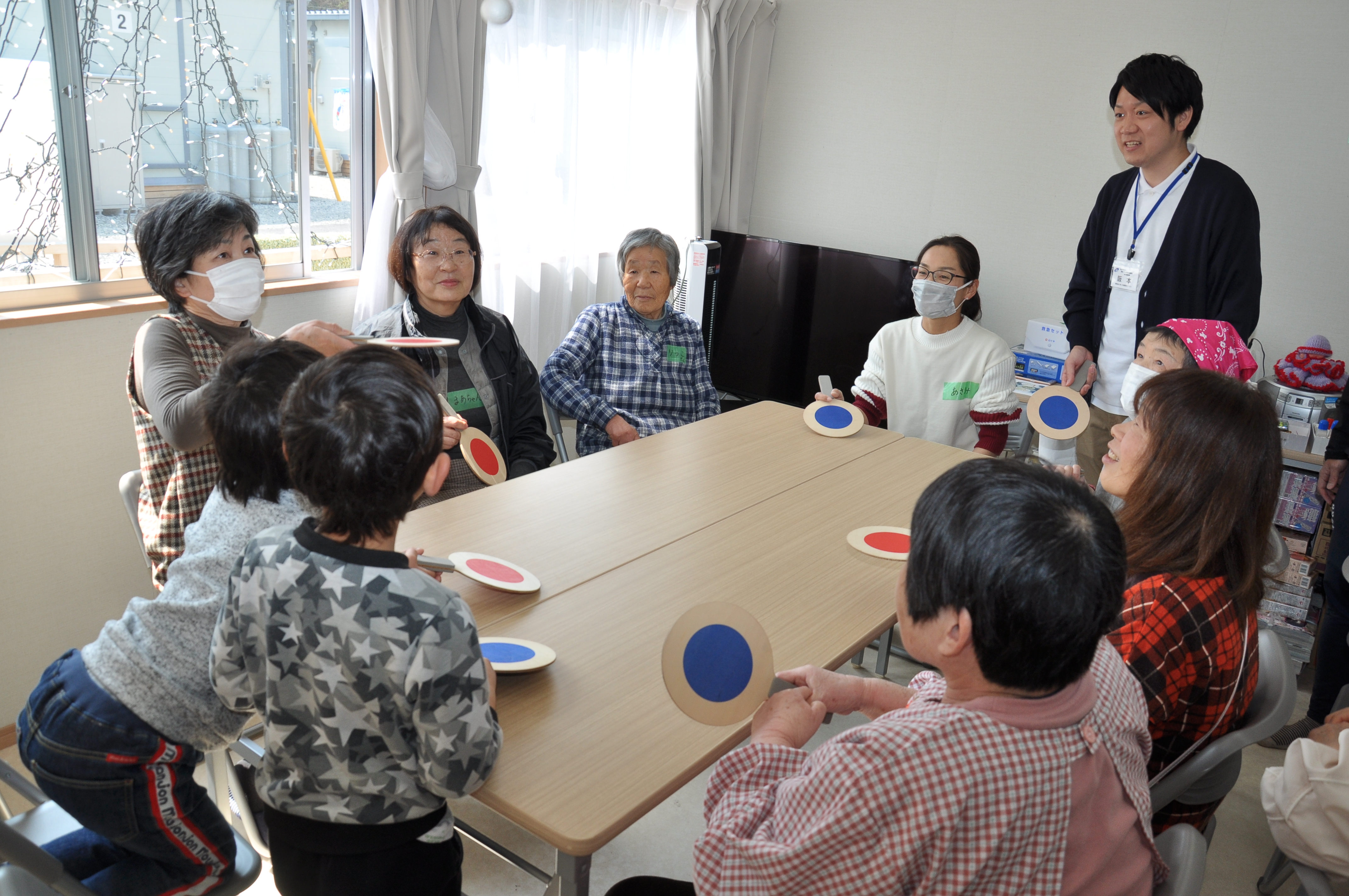 まずは、倉敷市社協松岡武司さん(右奥)によるゲーム。スタッフとして参加したメンバーも一緒に楽しみました。