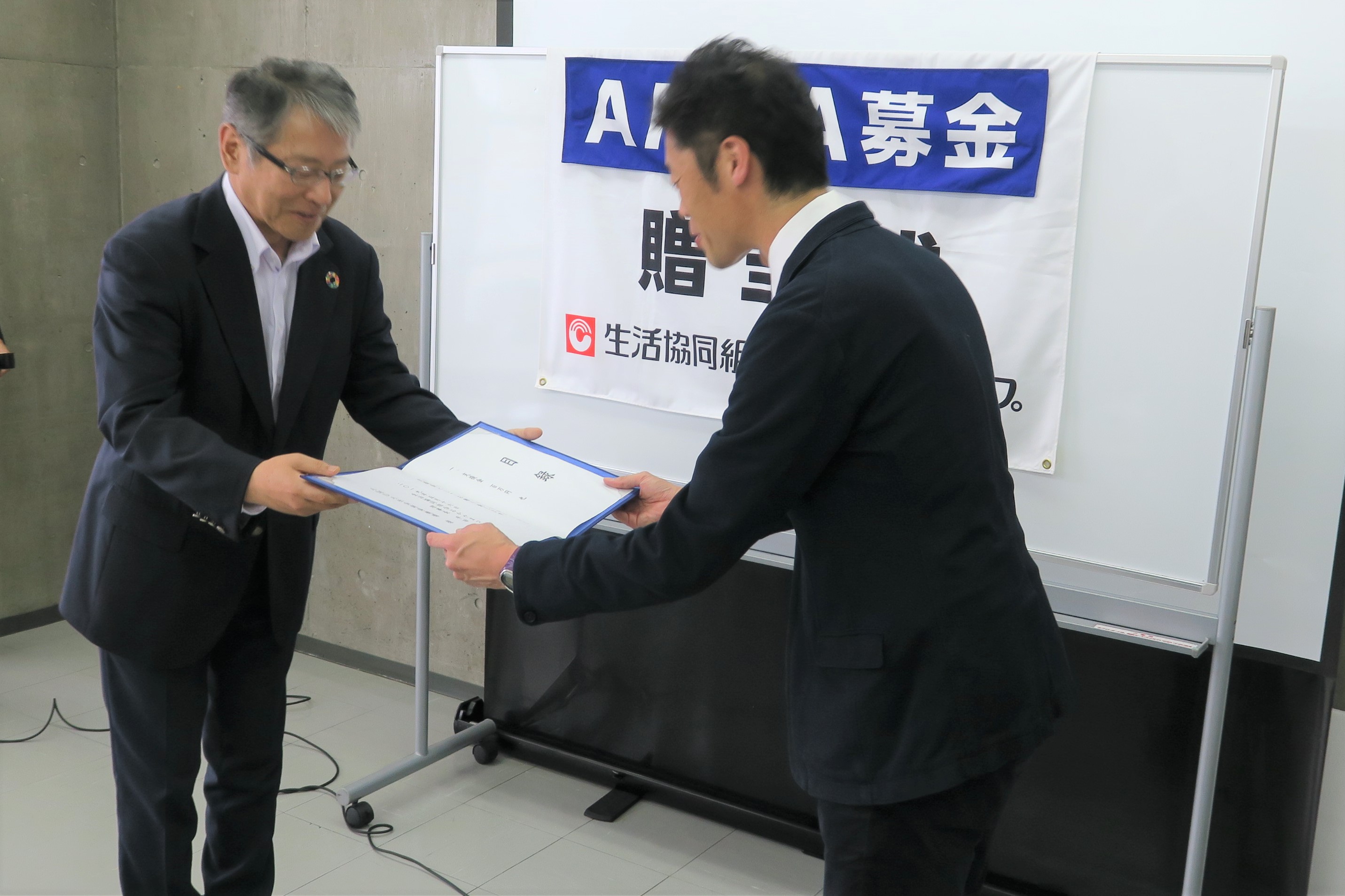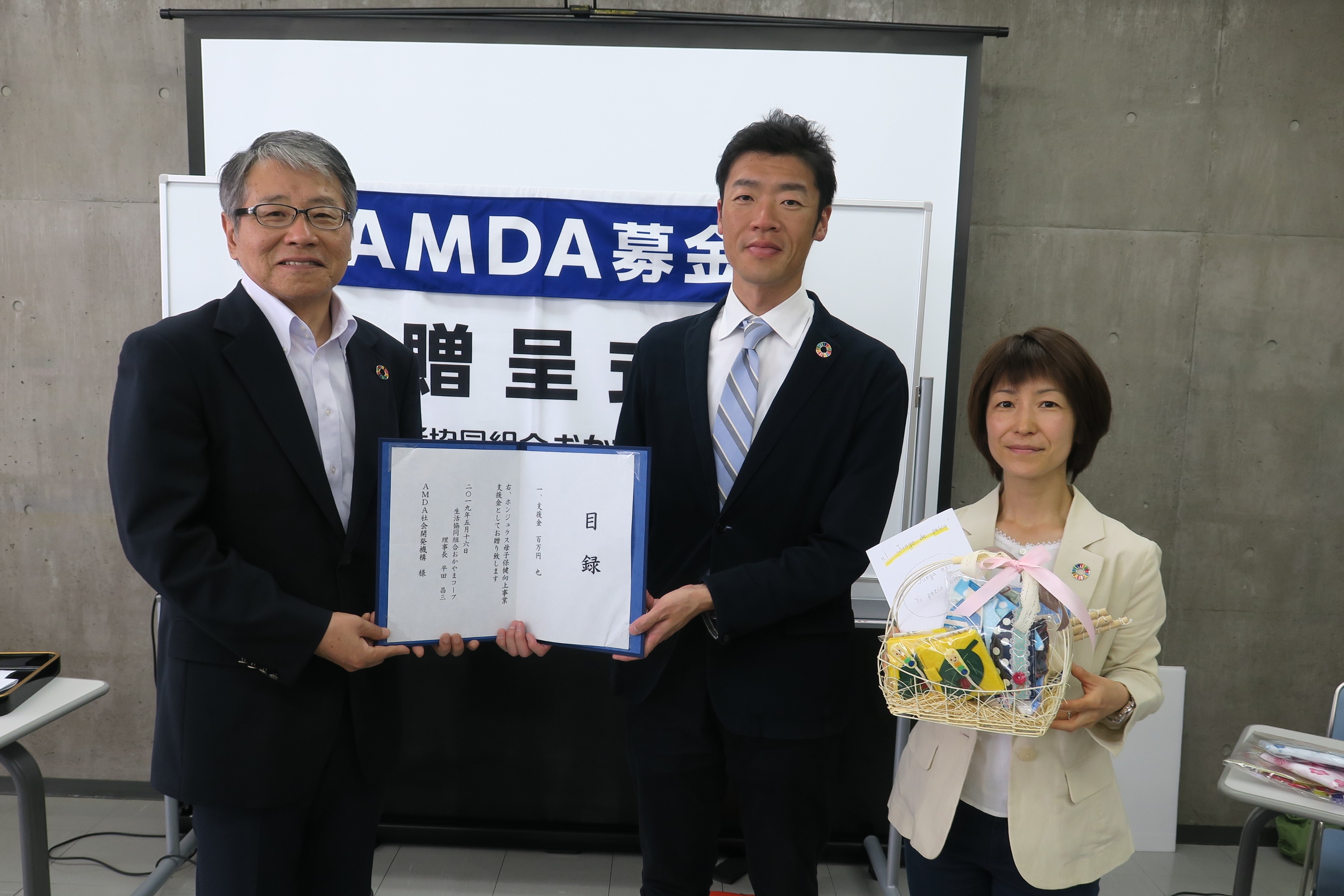 AMDA社会開発機構 田中部長(右)に目録を手渡す平田理事長