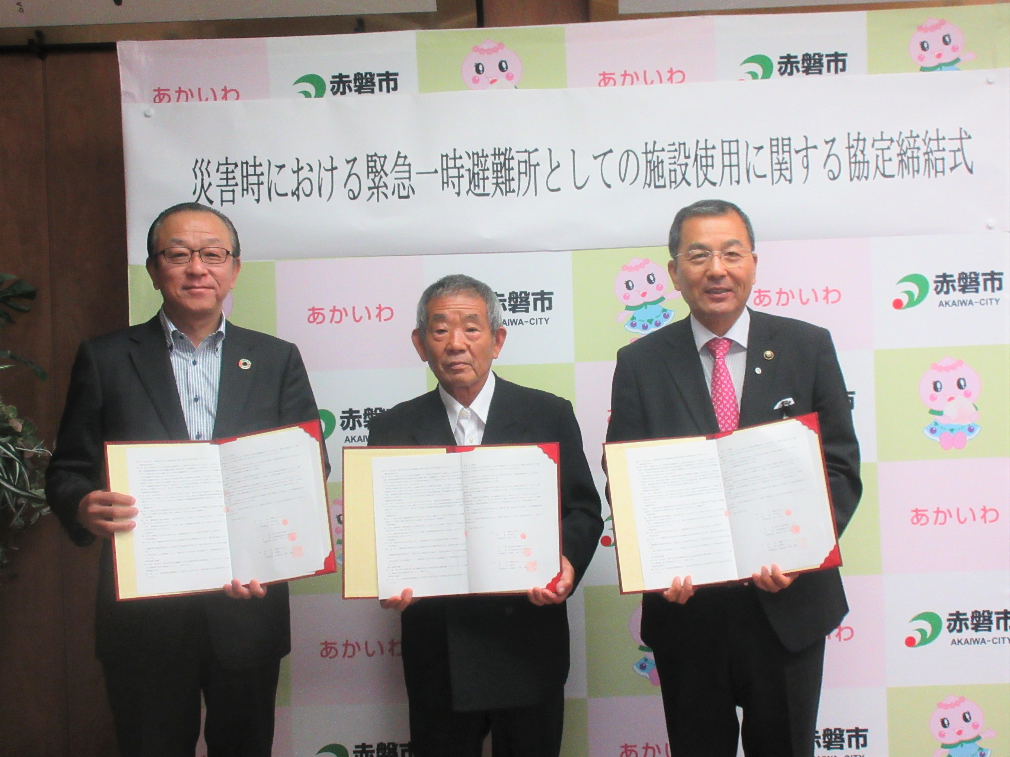 赤磐市市長室で行われた締結式にはおかやまコープ 三宅晴久常務理事と赤磐市 友實(ともざね)武則市長、下市区 山田吉彦区長が出席し協定書に署名しました。