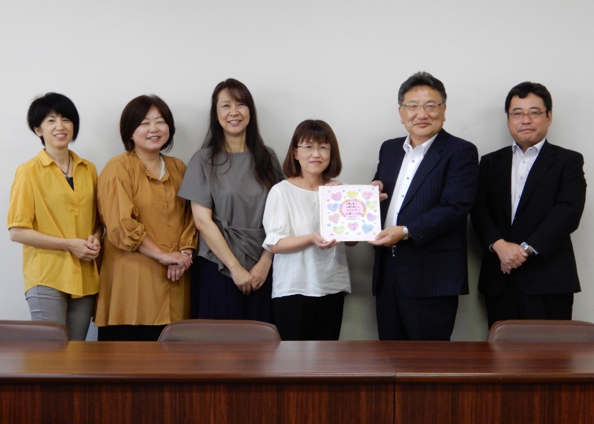 左から、おかやまコープ 鍋谷理恵子さん(井笠エリア理事)、金高さおりさん(全体理事)、岡城祐子さん(全体理事)、能勢幸子さん(岡山東エリア理事)、山陽乳業株式会社 砂内修治代表取締役社長、原井博孝常務取締役