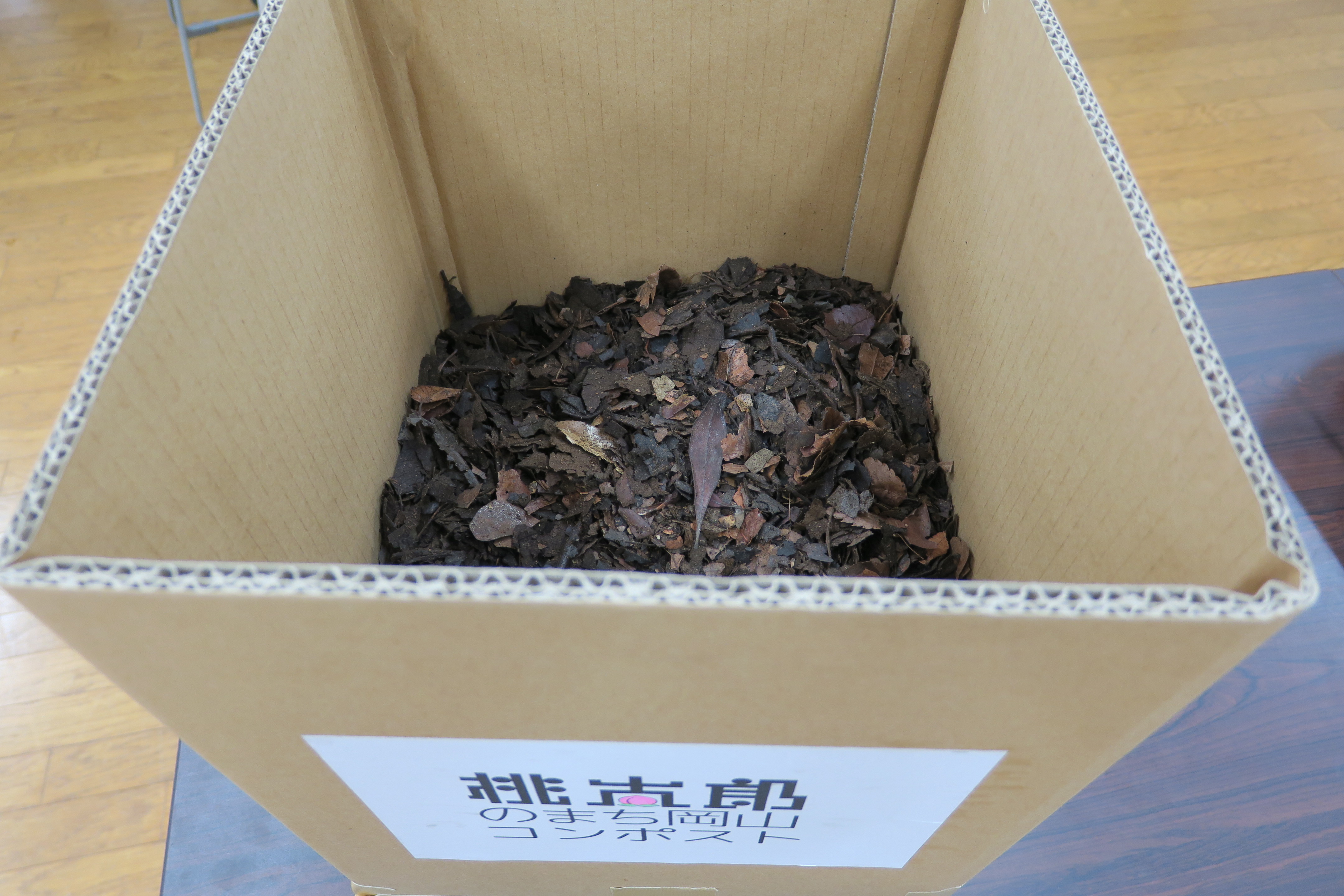 続いて「桃太郎のまち岡山コンポスト」についての説明と、段ボールコンポスト作りの実演がありました。生ごみをリサイクルすることで、ごみの減量化・資源化を促進する取り組みです。