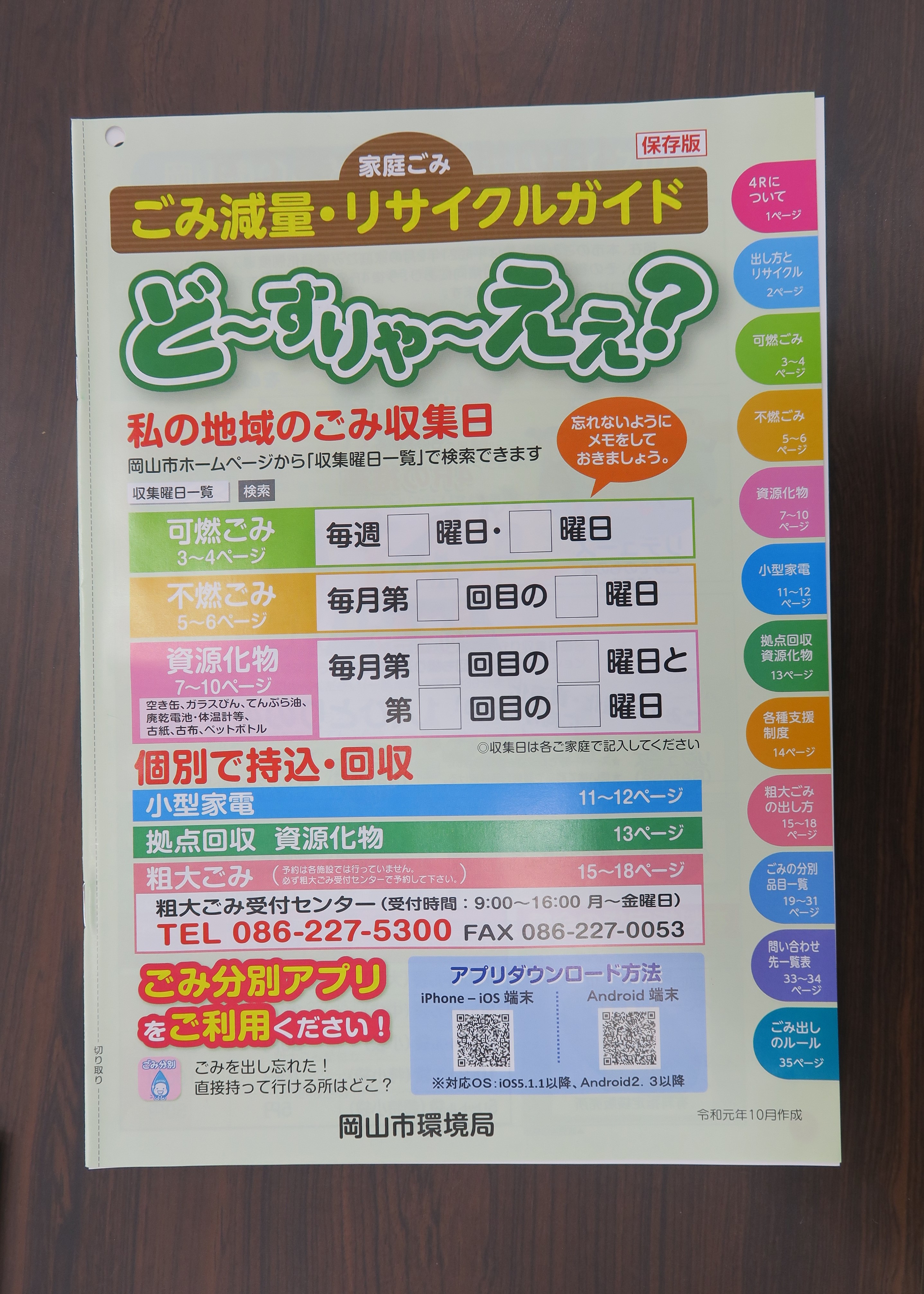 『【家庭ごみ】ごみ減量・リサイクルガイド〈ど~すりゃ~えぇ?〉』(発行:岡山市)