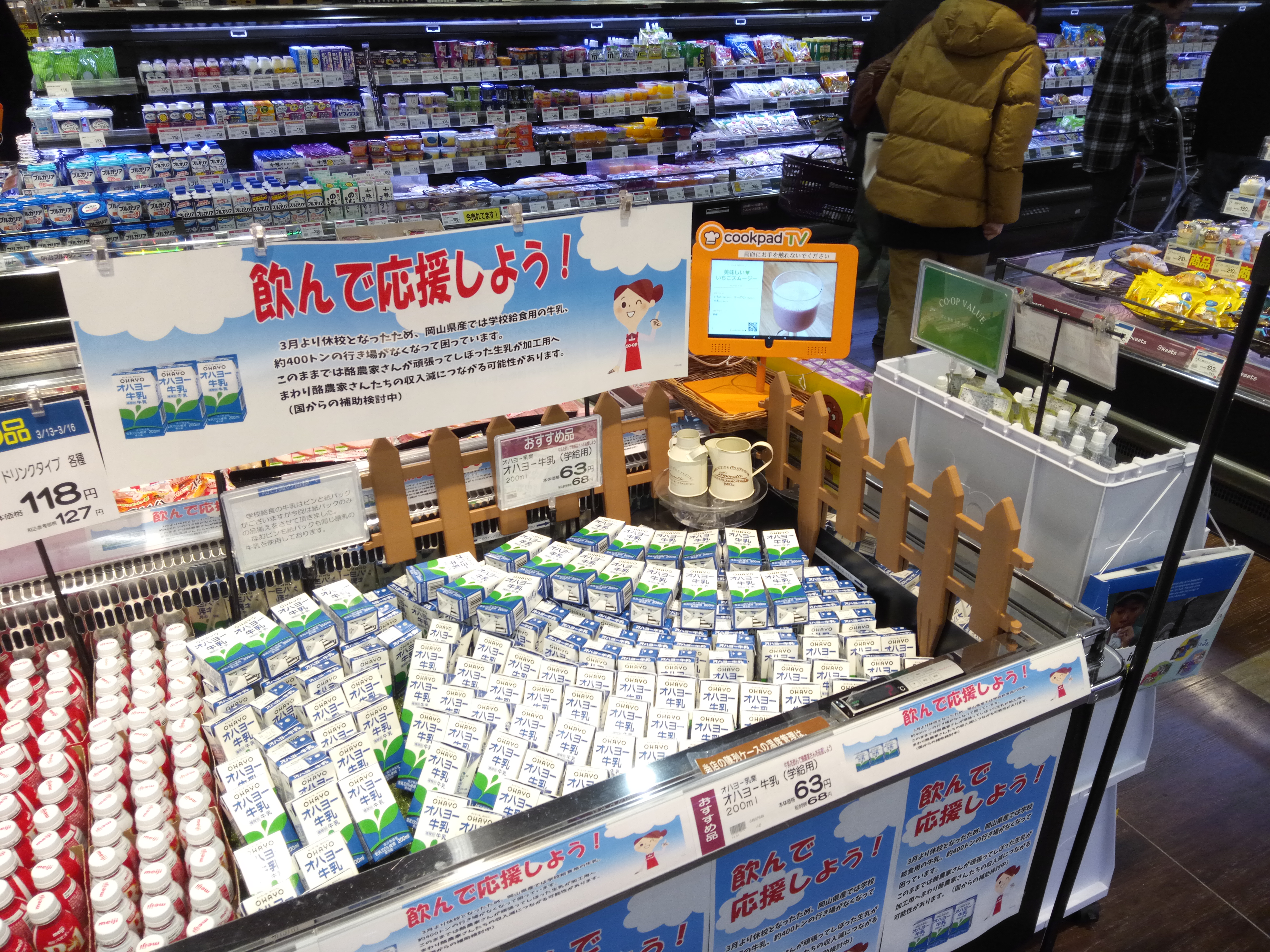 このような状況を受け、おかやまコープは県内の酪農家さんを応援するため、3月15日(日)~全11店舗で特設コーナーを設けて、給食用牛乳を販売しています。