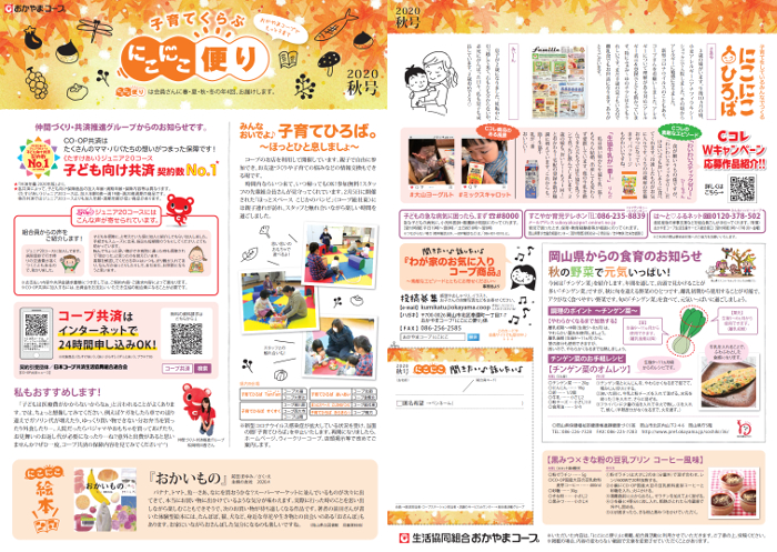 HOME 最新情報・お知らせ 「にこにこ便り」2020秋号 発行しました 最新情報・お知らせ 「にこにこ便り」2020秋号 発行しました 2020/09/18 子育てくらぶ「にこにこ便り」2020秋号を発行しました。 今回の「にこにこレポート」は、「子育てひろば」(コープ総社東)です。 また、「CO・OP共済」《たすけあい》ジュニアコースの紹介も掲載しています。 コープのお店のラック等にも置いてありますので、ぜひご覧ください。 ↓クリックしてご覧ください↓ ●にこにこだよりHPはこちらから https://okayama.coop/kosodate/#nikoniko お知らせ一覧に戻る