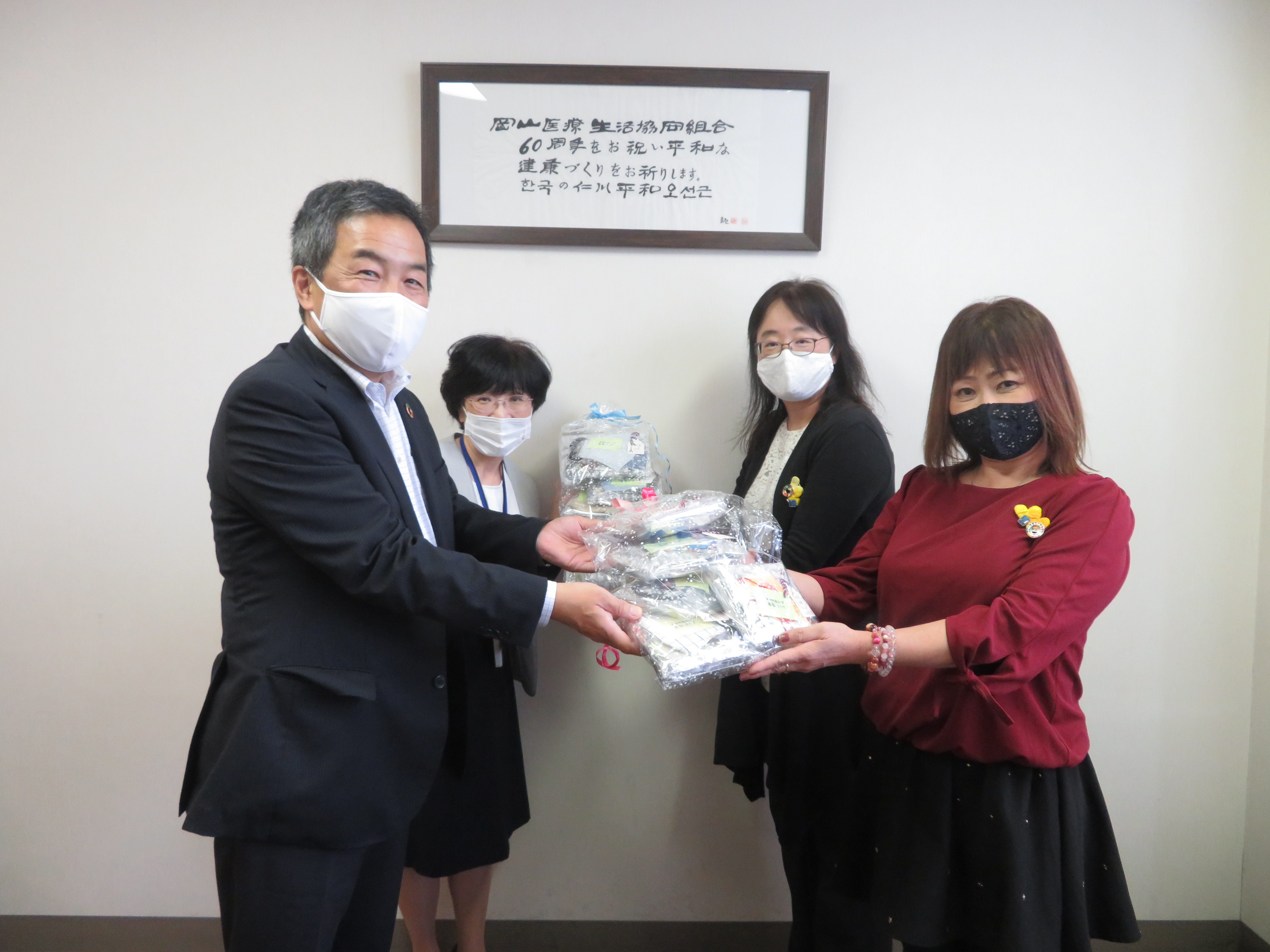 当日は、倉敷エリア 西條節美エリア理事と清水美佐代エリア委員長が岡山医療生協を訪問し、岡山医療生協 和田博知専務理事と岡山協立病院 船守智恵美課長に直接マスクを手渡しました。