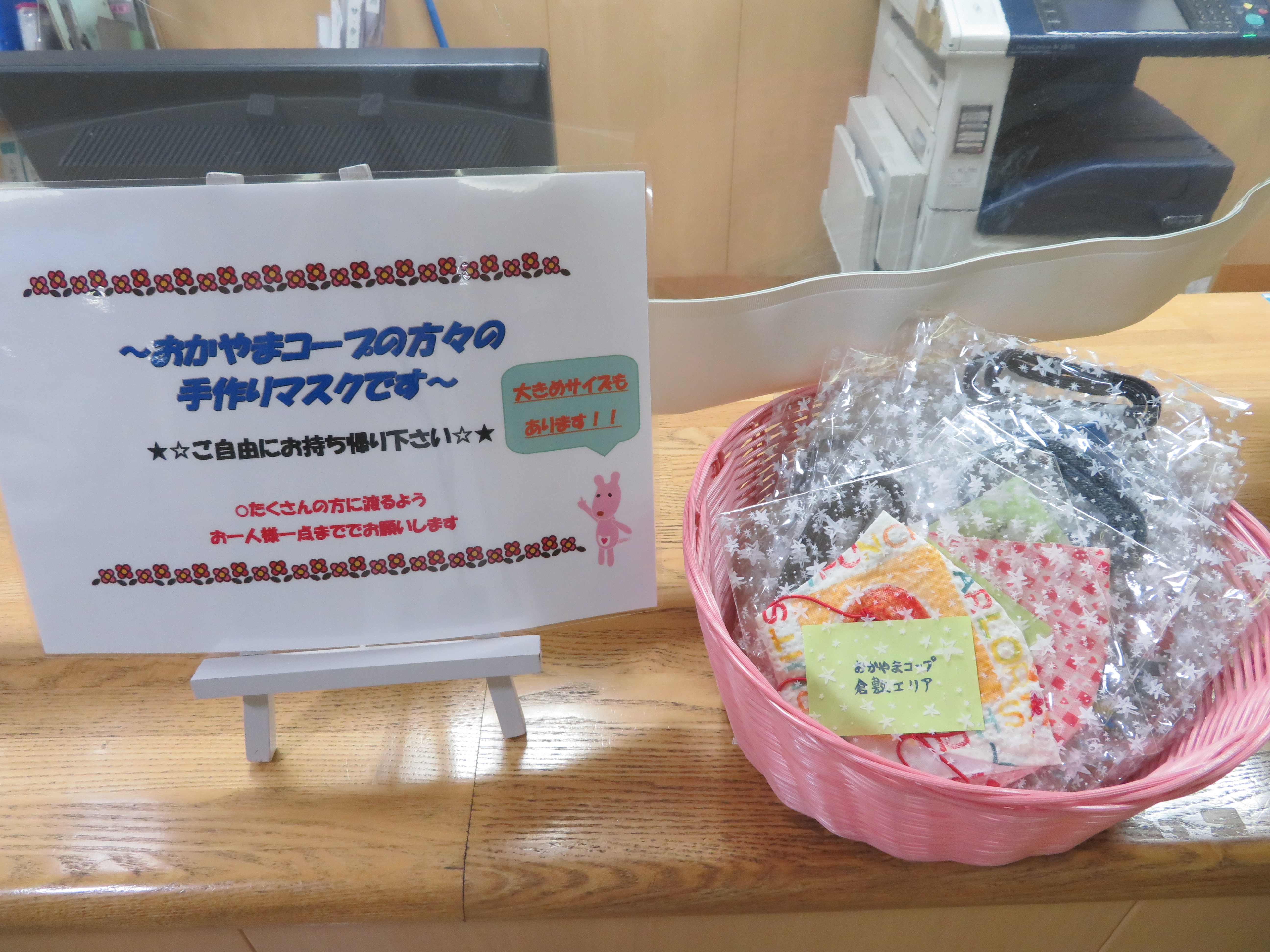岡山協立病院の総合受付に置かれた手作りマスク