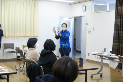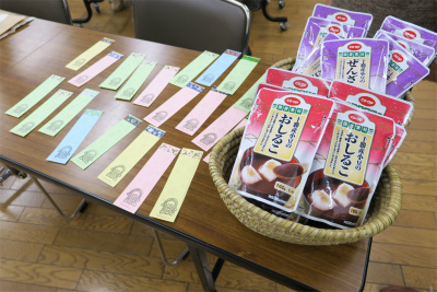 会の最後にコープのぜんざい・おしるこの商品紹介があり、参加者手作りの「“アマビエ”のしおり」がプレゼントされました。
