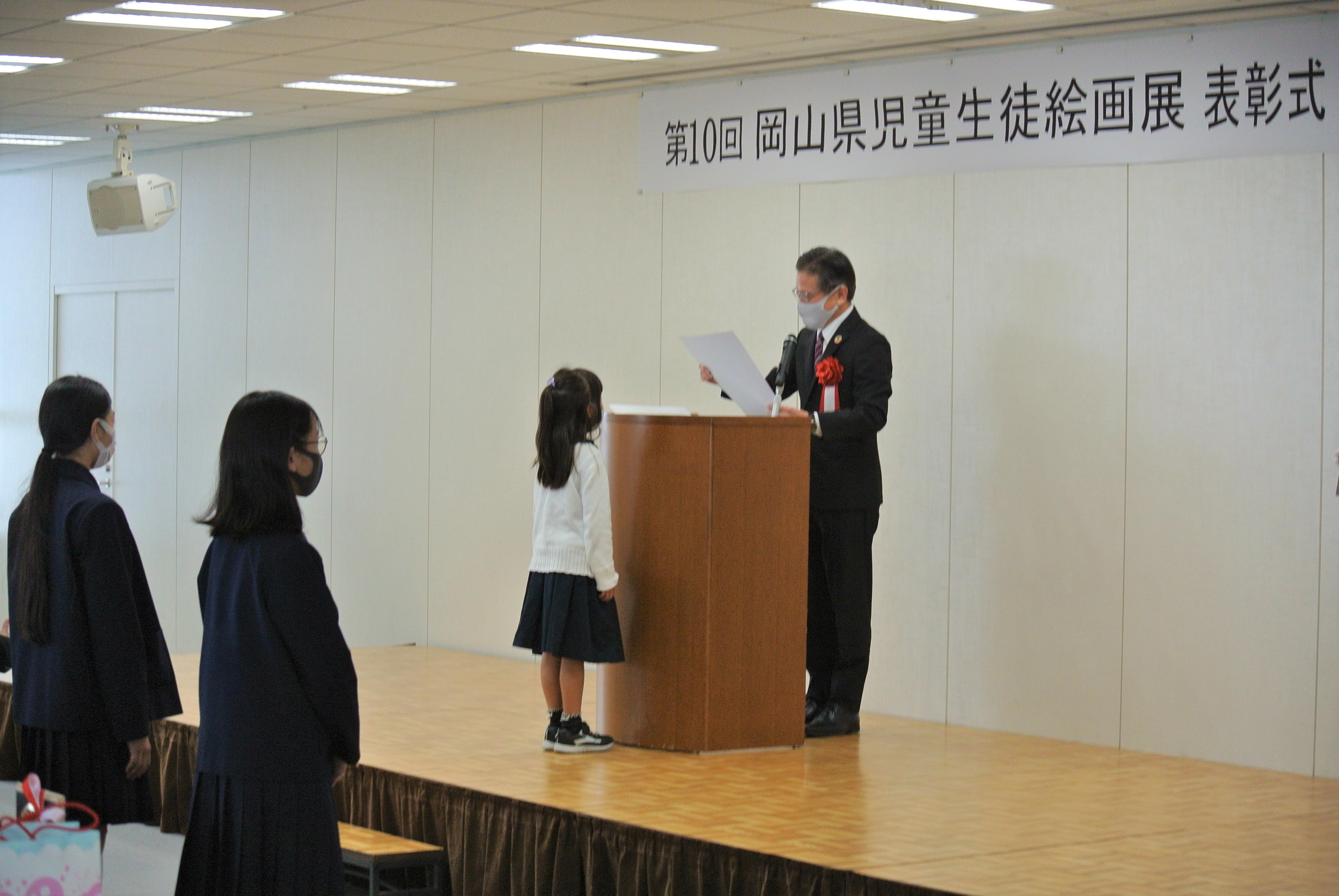 受賞式には、おかやまコープから上甲啓一組織本部長が出席し、児童生徒一人ひとりに、表彰状とコープ商品のお菓子詰め合わせを贈りました。