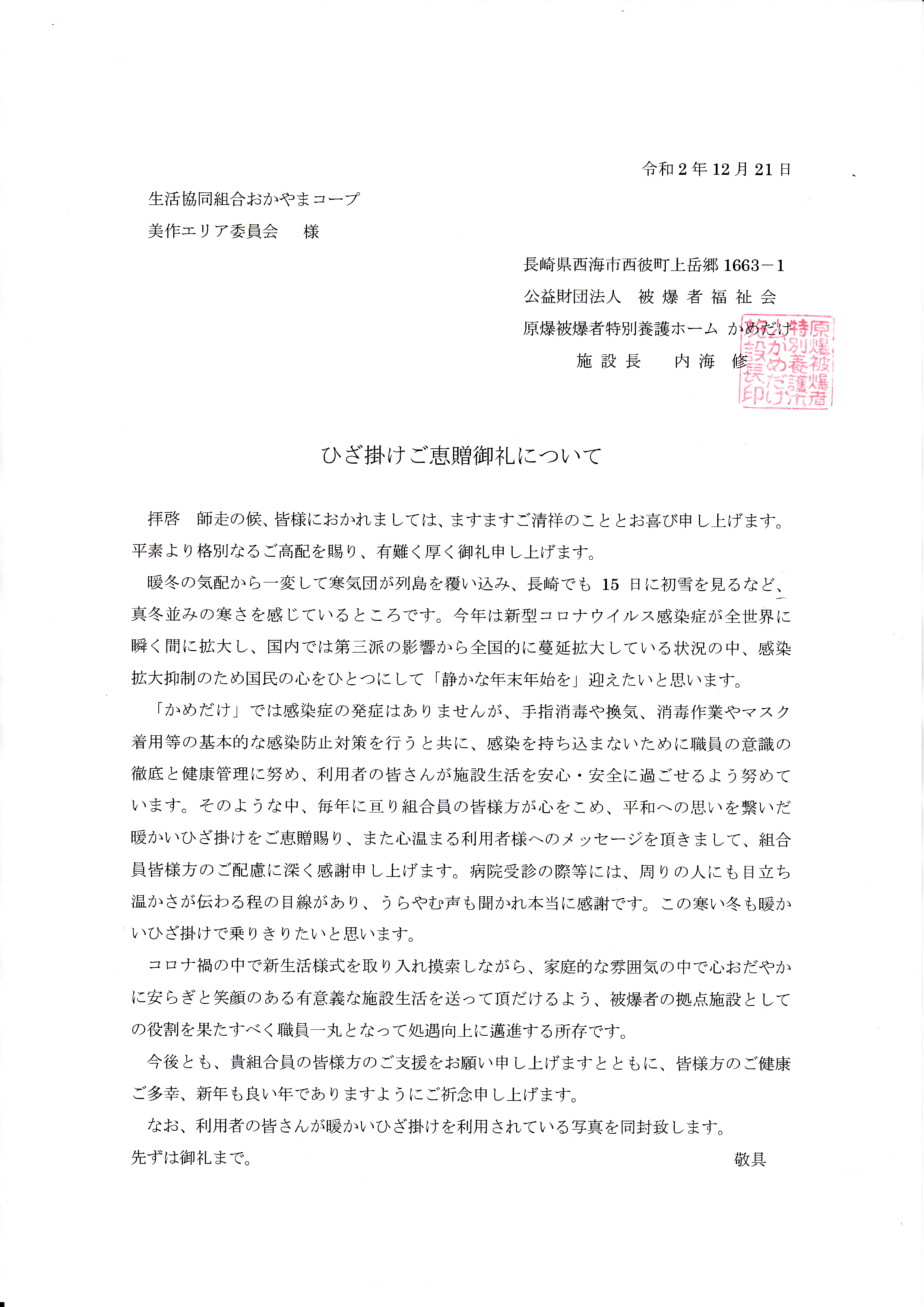 HOME 最新情報・お知らせ 「へいわのひざかけ」のお礼が「原爆被爆者特別養護ホームかめだけ」の皆様から届きました 最新情報・お知らせ 「へいわのひざかけ」のお礼が「原爆被爆者特別養護ホームかめだけ」の皆様から届きました 2021/02/09 昨年12月に組合員さん手作りの「へいわのひざかけ」をお贈りした「原爆被爆者特別養護ホームかめだけ」の皆様から、お礼状と写真が届きました。 かめだけの皆様、ありがとうございます! 「へいわのひざかけ」について詳しくはこちらの記事をご覧ください。 「へいわのひざかけ モチーフをつなごう」(美作エリア)を開催 お知らせ一覧に戻る