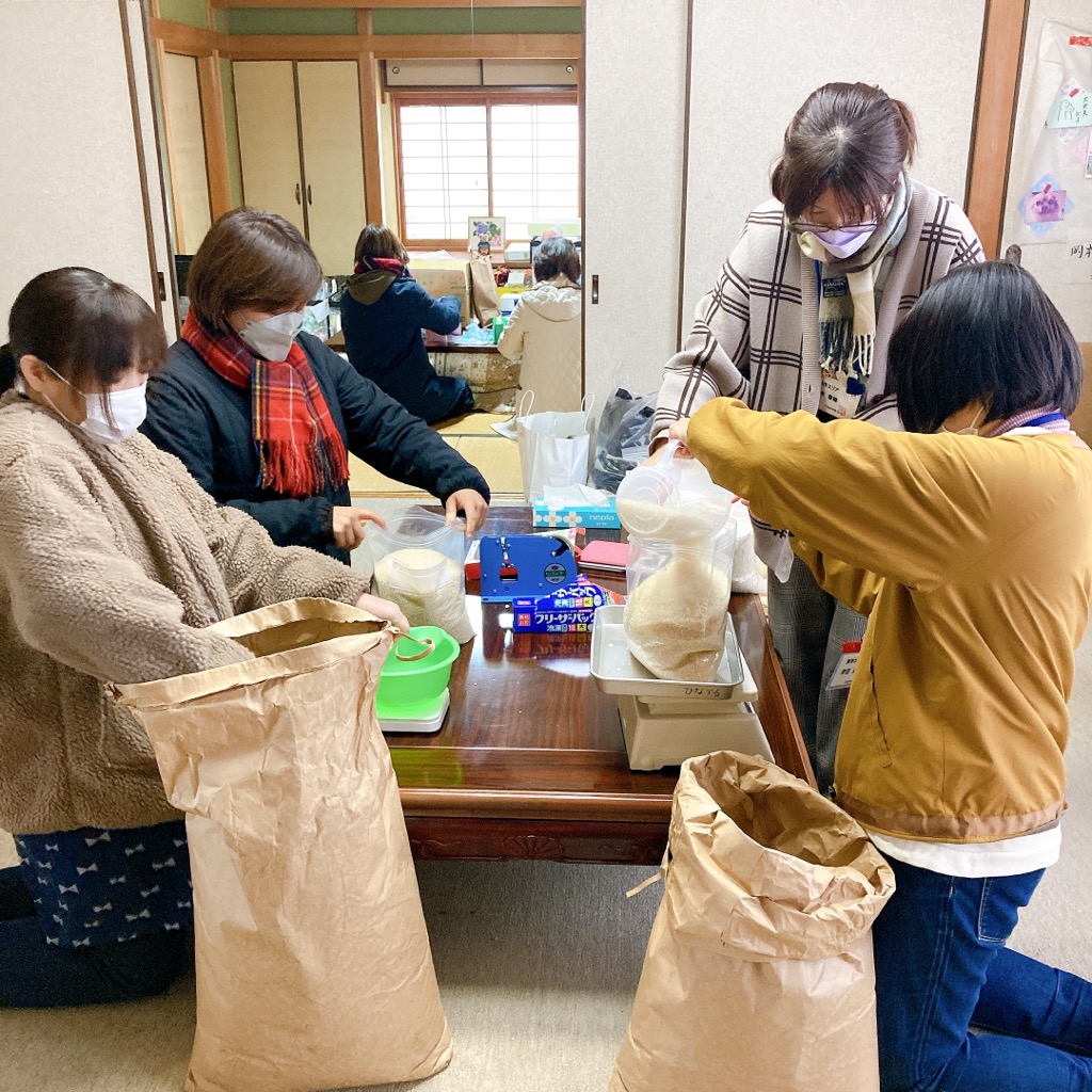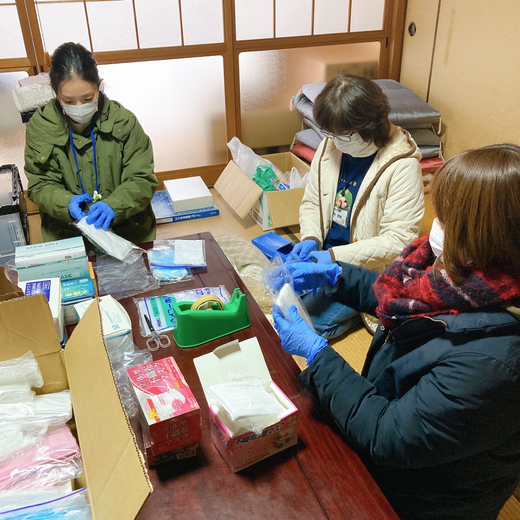 お米を3kgずつ、マスクを5枚ずつ、お菓子を数個ずつ、タオルとせっけんを組み合わせて・・・と、さまざまな品物を小分けしていきます。