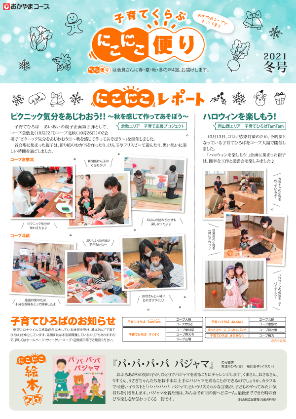 HOME 最新情報・お知らせ 「にこにこ便り」2021冬号 発行しました 最新情報・お知らせ 「にこにこ便り」2021冬号 発行しました 2021/12/17 子育てくらぶ「にこにこ便り」2021冬号を発行しました。 今回の内容は、「ピクニック気分をあじわおう!!~秋を感じて作ってあそぼう~(倉敷エリア 子育て応援プロジェクト)、「ハロウィンを楽しもう!」(岡山西エリア 子育てひろばTamTam)のにこにこレポートです。 コープのお店のラック等にも置いてありますので、ぜひご覧ください。 ↓こちらをクリック↓ ⇒バックナンバーはこちらから お知らせ一覧に戻る