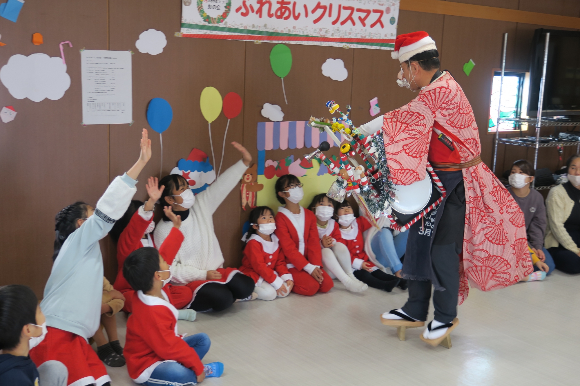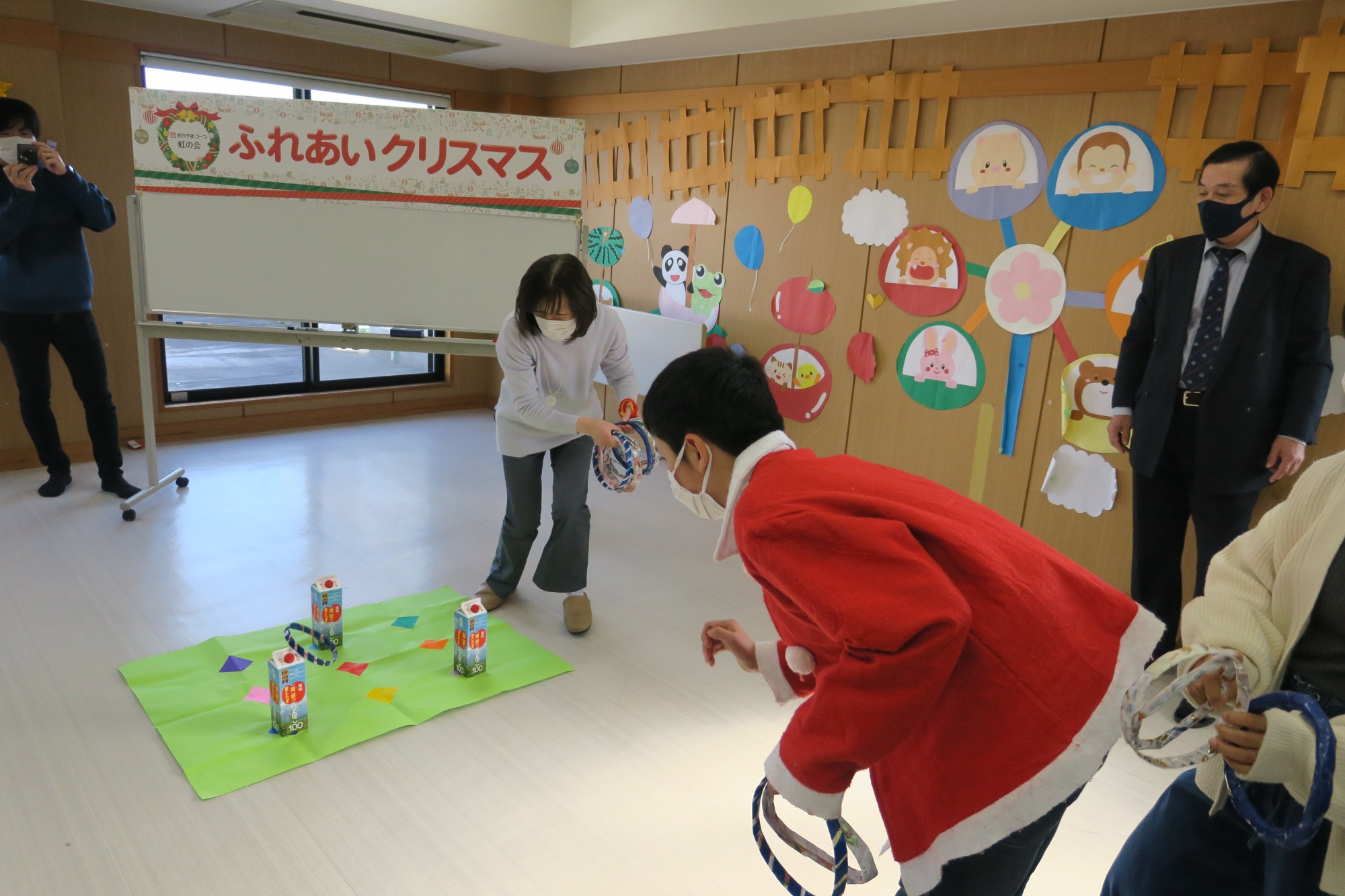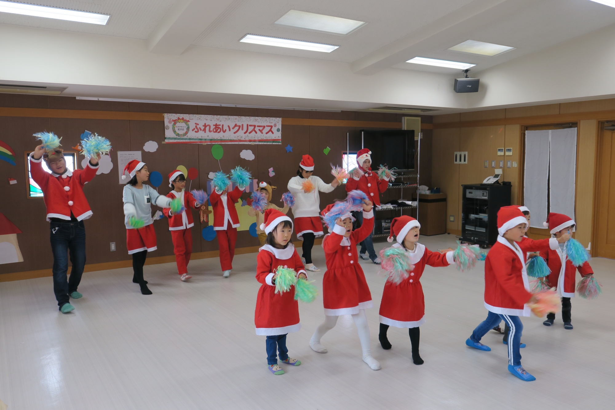 当日は、クリスマスイブ前日ということで、施設では「ふれあいクリスマス会」が開かれ、子どもたちはゲームやダンスなどの出し物で楽しい時間を過ごしました。