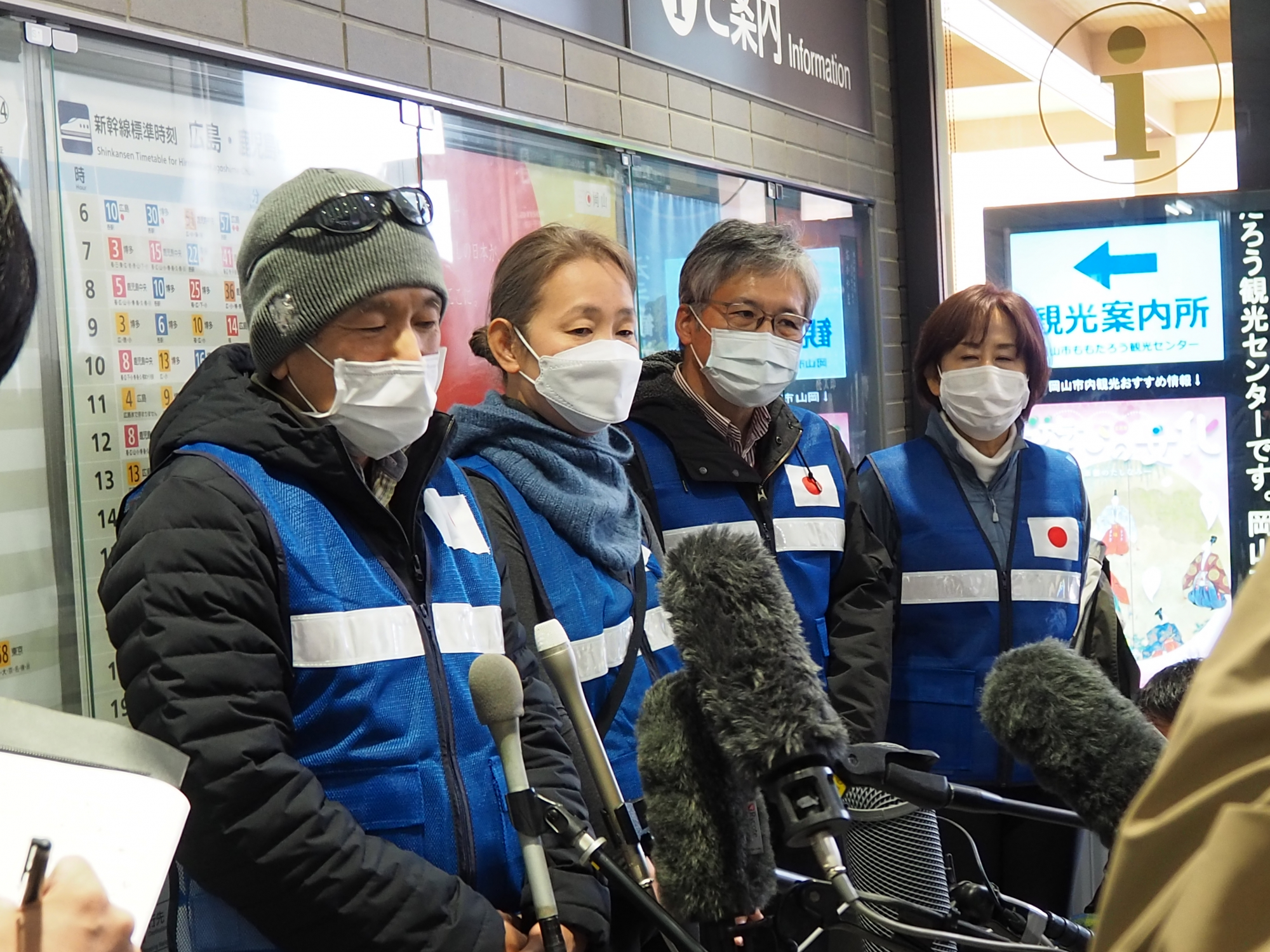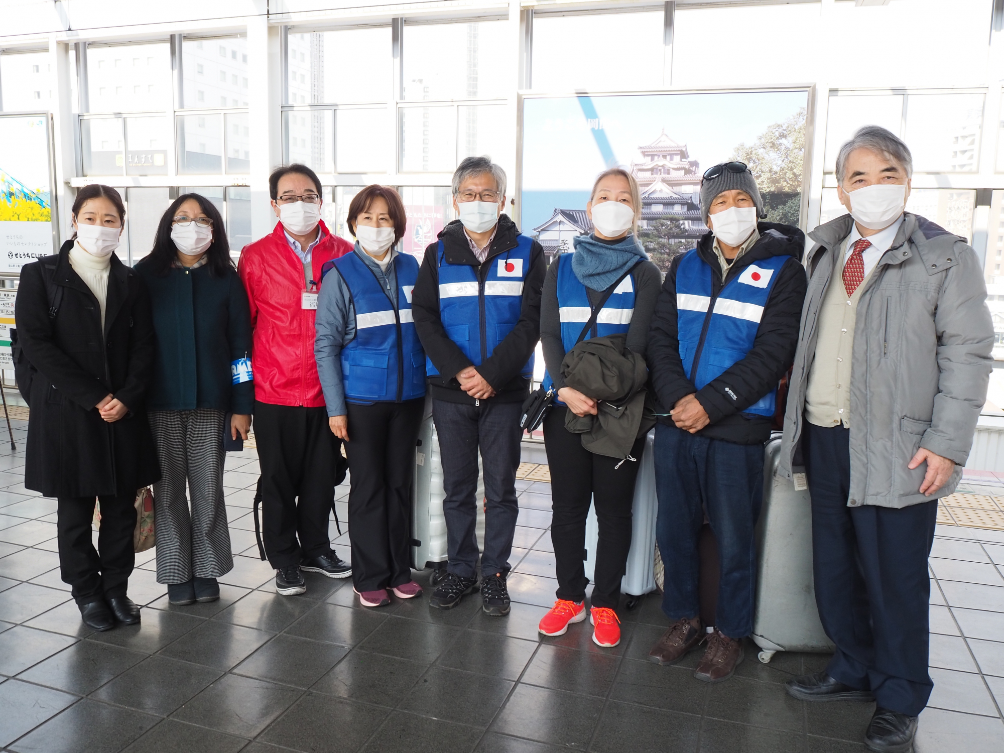 おかやまコープ職員も岡山駅で4名のチームをお見送り(右端:AMDA 菅波茂理事長)