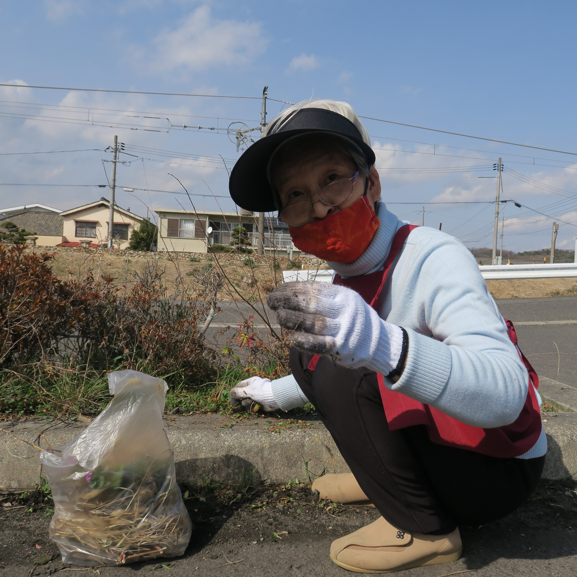 今回がこのプロジェクト初の活動ということで、岡山市の保健福祉局の方や東区地域包括支援センターの方も駆けつけて見守る中、利用者さん達は、建物周りや植え込みの雑草を見つけては次々に抜いてくださっていました。