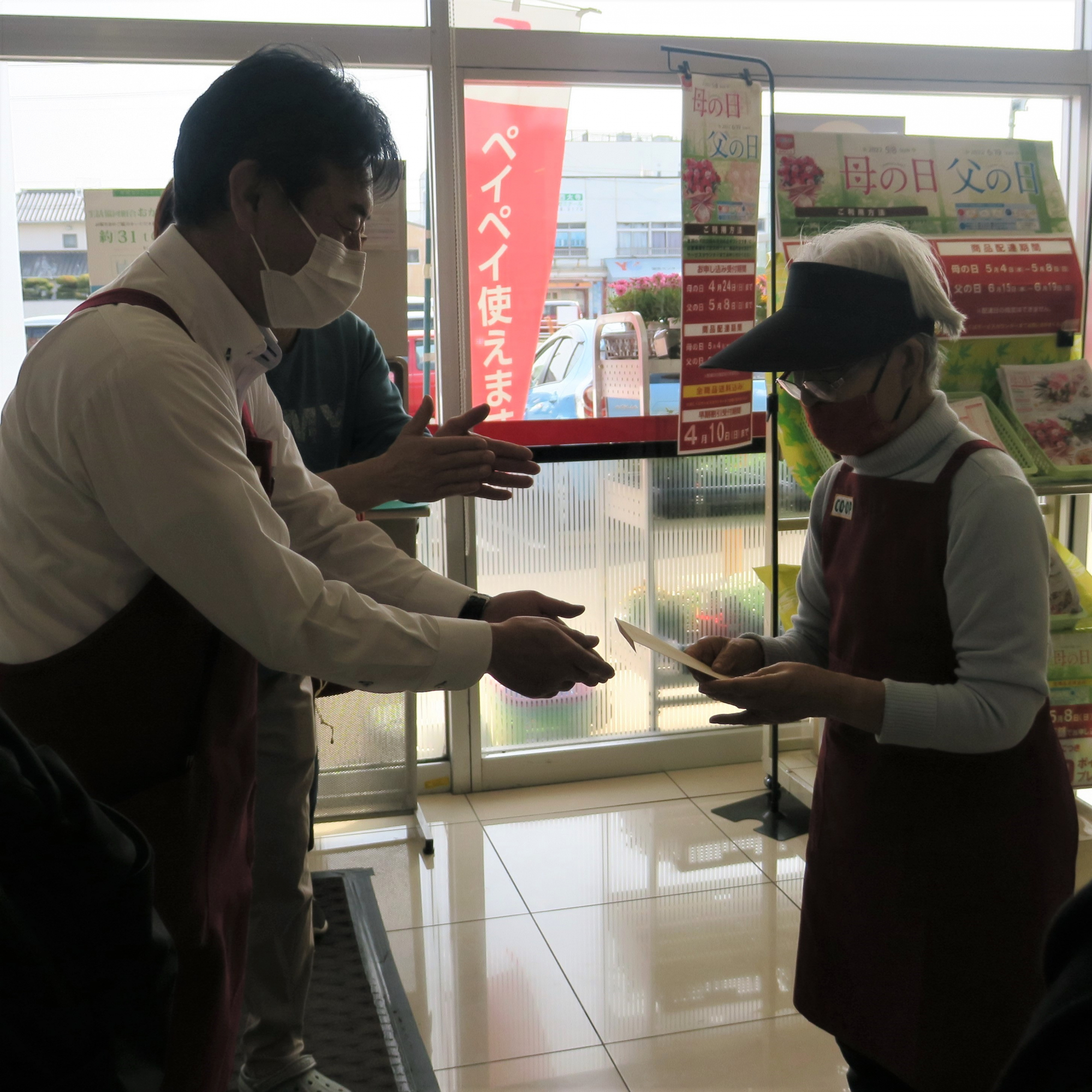 作業後、コープ西大寺 黒瀬店長から賃金の入った封筒が手渡されると、利用者さんは店内で早速「どら焼」を購入していました。コープのご利用ありがとうございます!
