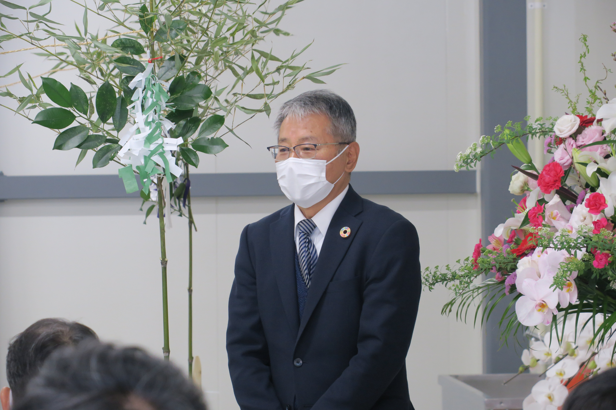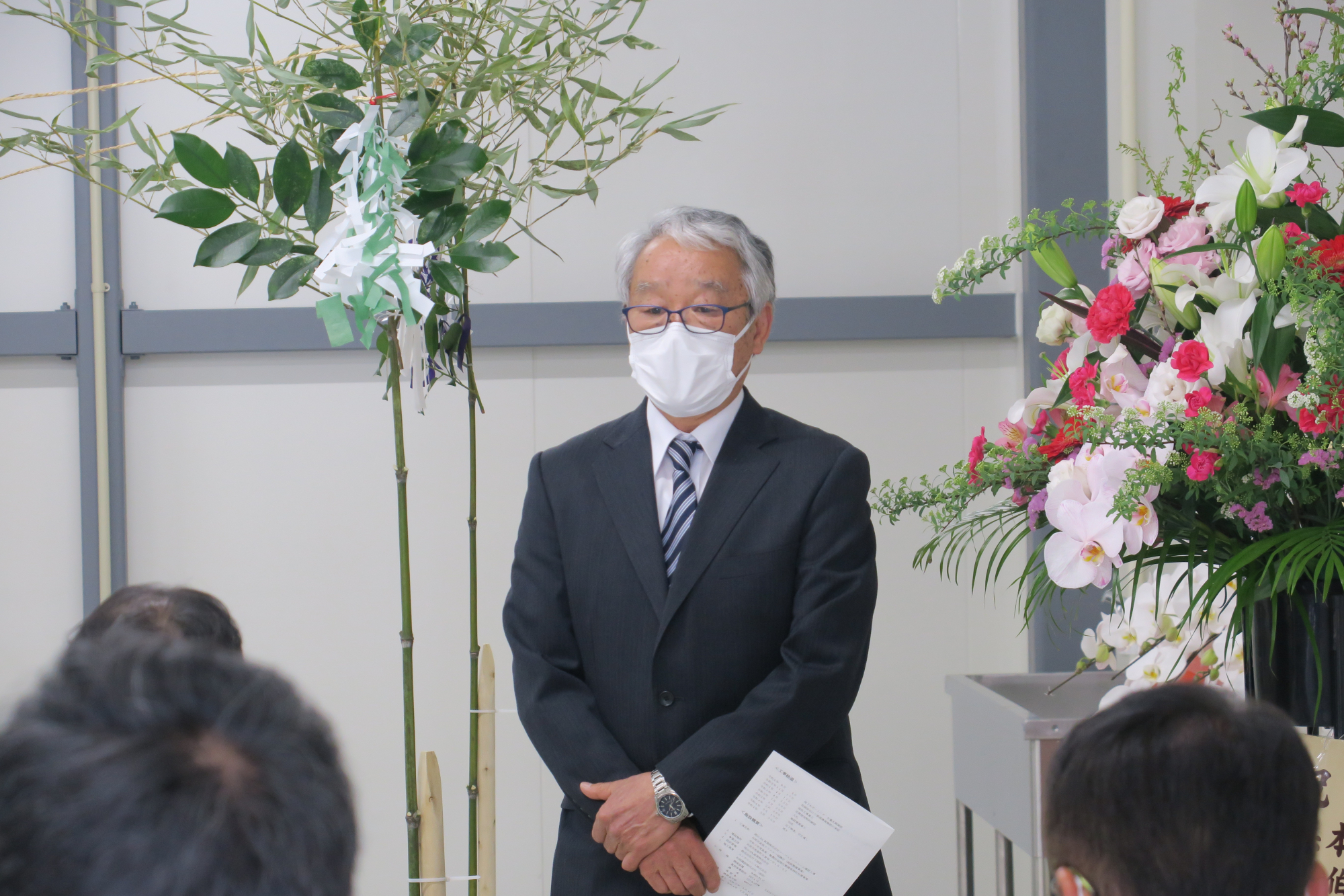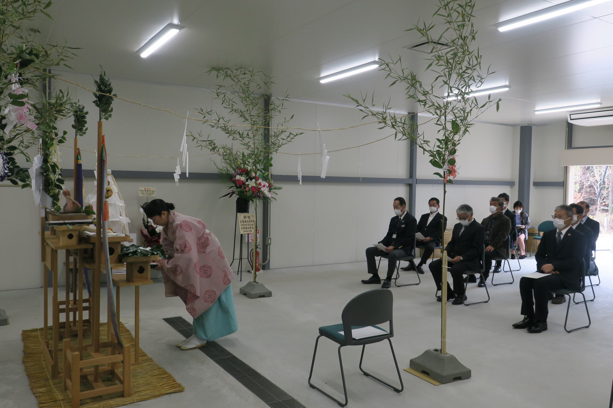 迫本宮司による祝詞奏上(のりとそうじょう)や玉串奉奠(たまぐしほうてん)などの神事が行われた後、式典では岡山JA畜産 菱川社長から「組合員さんに安心して食べてもらえる卵を生産し、地域の方から喜ばれる農場を目指して頑張っていきます」とあいさつがありました。