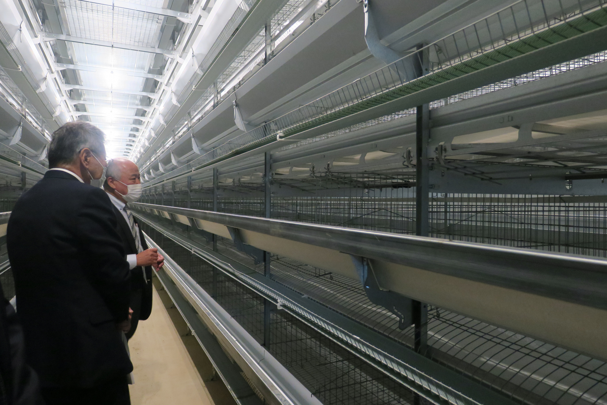 式典の後、参加者は、密閉性が高く室温を管理しやすい「ウインドレス鶏舎」や採れた卵を自動的に集める「集卵舎」、鶏のふんを肥料にする「堆肥舎」などオートメーション化された最新設備の新鶏舎を見学しました。「ウインドレス鶏舎」は温度を制御し、夏場も快適な環境で飼育できるとともに、鳥インフルエンザなど感染防止にも有効で、組合員に安定的にたまごを供給することが期待できます。