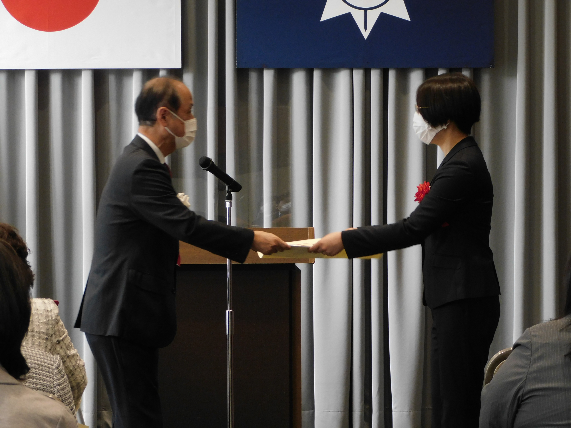 大森市長(左)から賞状を受け取る福祉グループ宮﨑さん