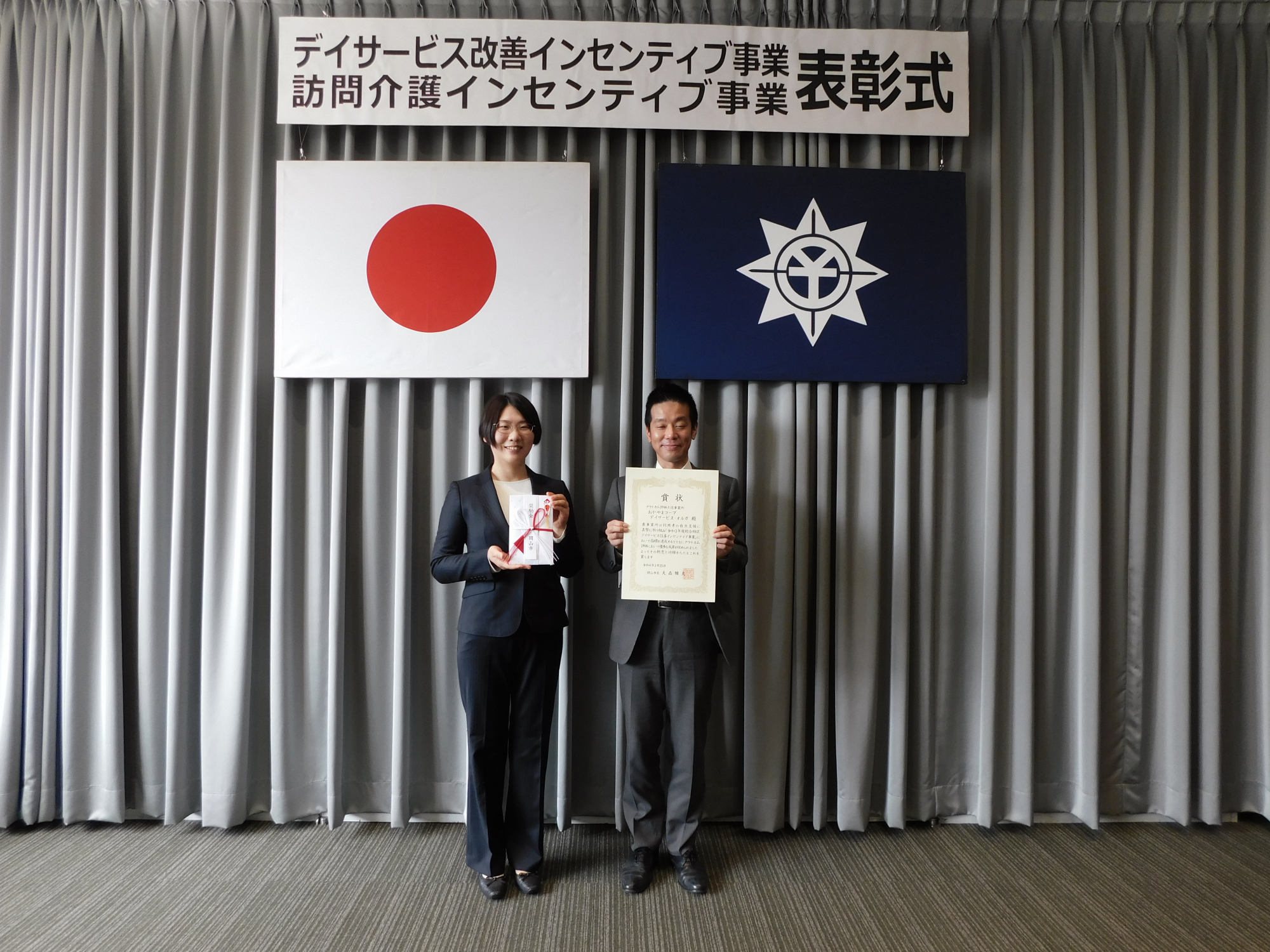 質の評価基準として5つのストラクチャー・プロセスを評価し、達成事業所には表彰状の授与と岡山市のHPへ掲載されます。その中でも特に評価された上位10事業所には岡山市長から「デイサービス改善インセンティブ事業」として表彰状授与と奨励金の付与があり、今回デイサービス・オルガが第3位で表彰されました。