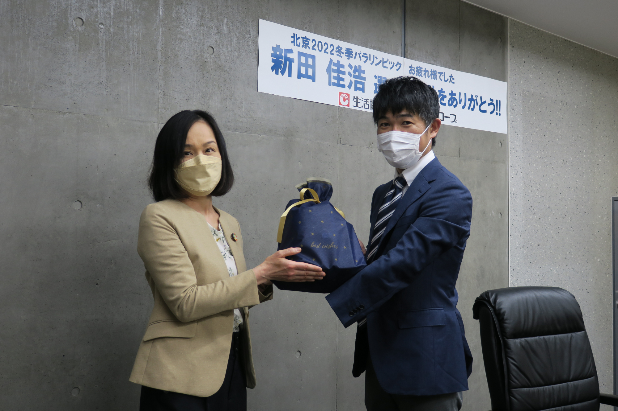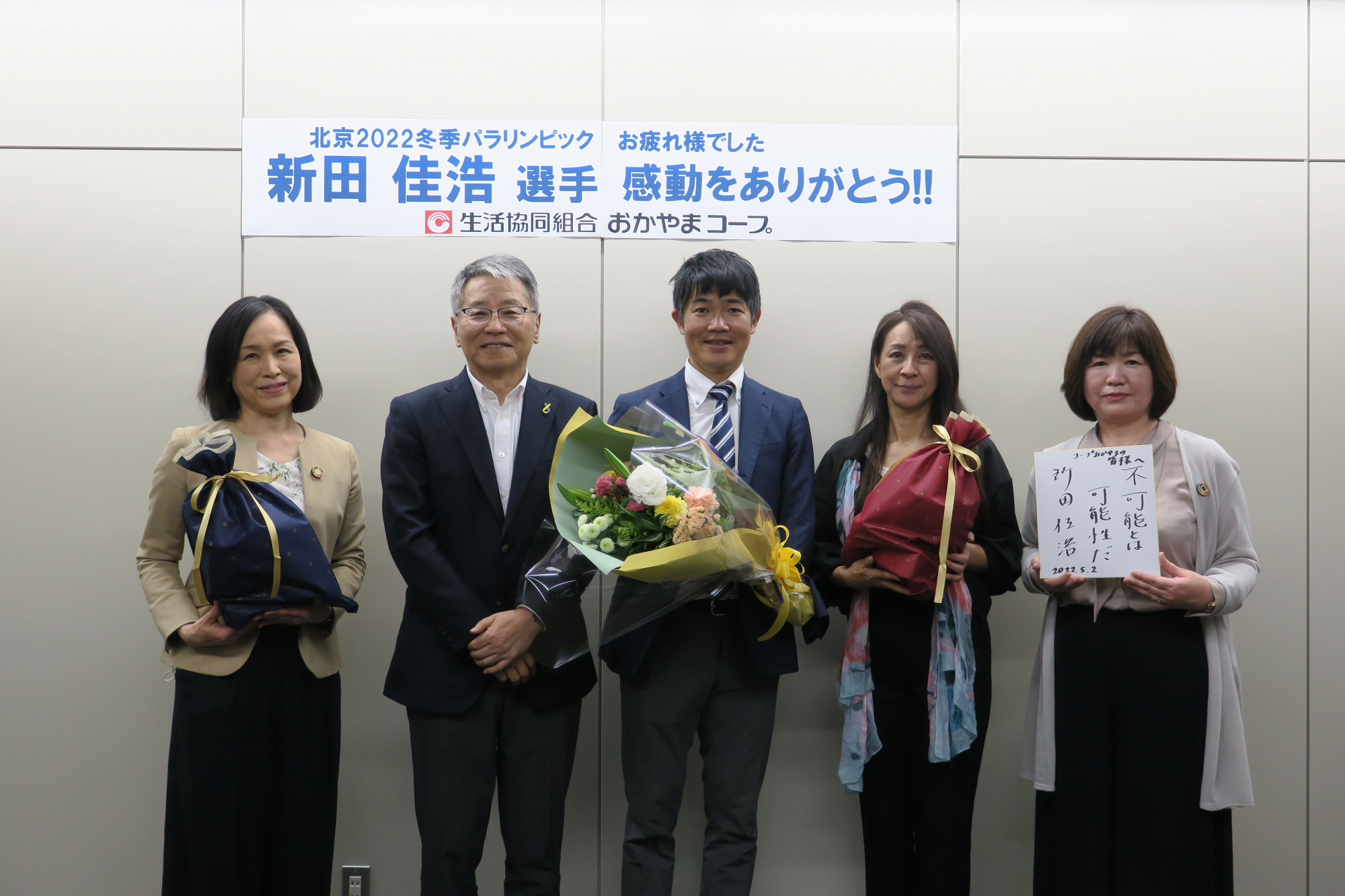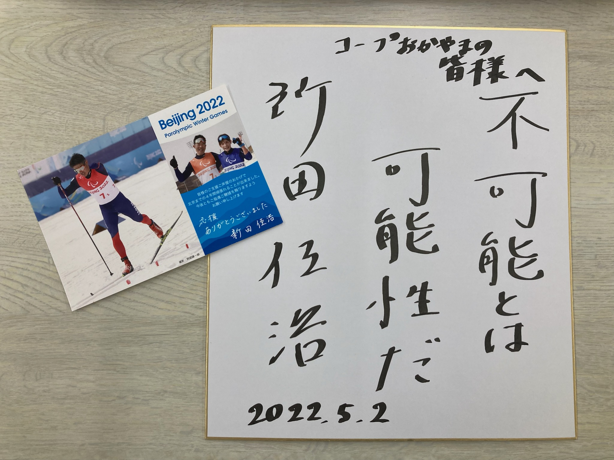 おかやまコープは、西粟倉村出身の新田選手を応援しており、北京2022冬季パラリンピックにはコープ商品と応援旗を届けていました。