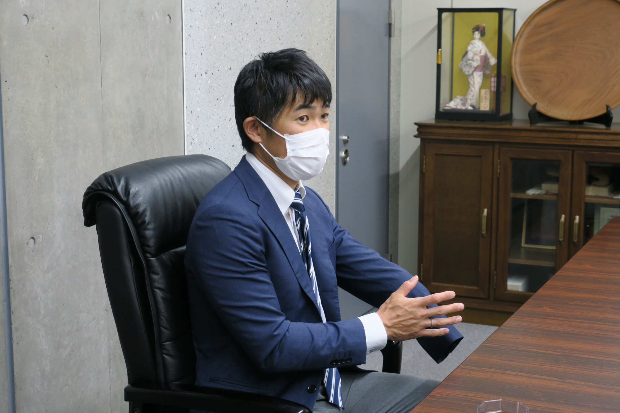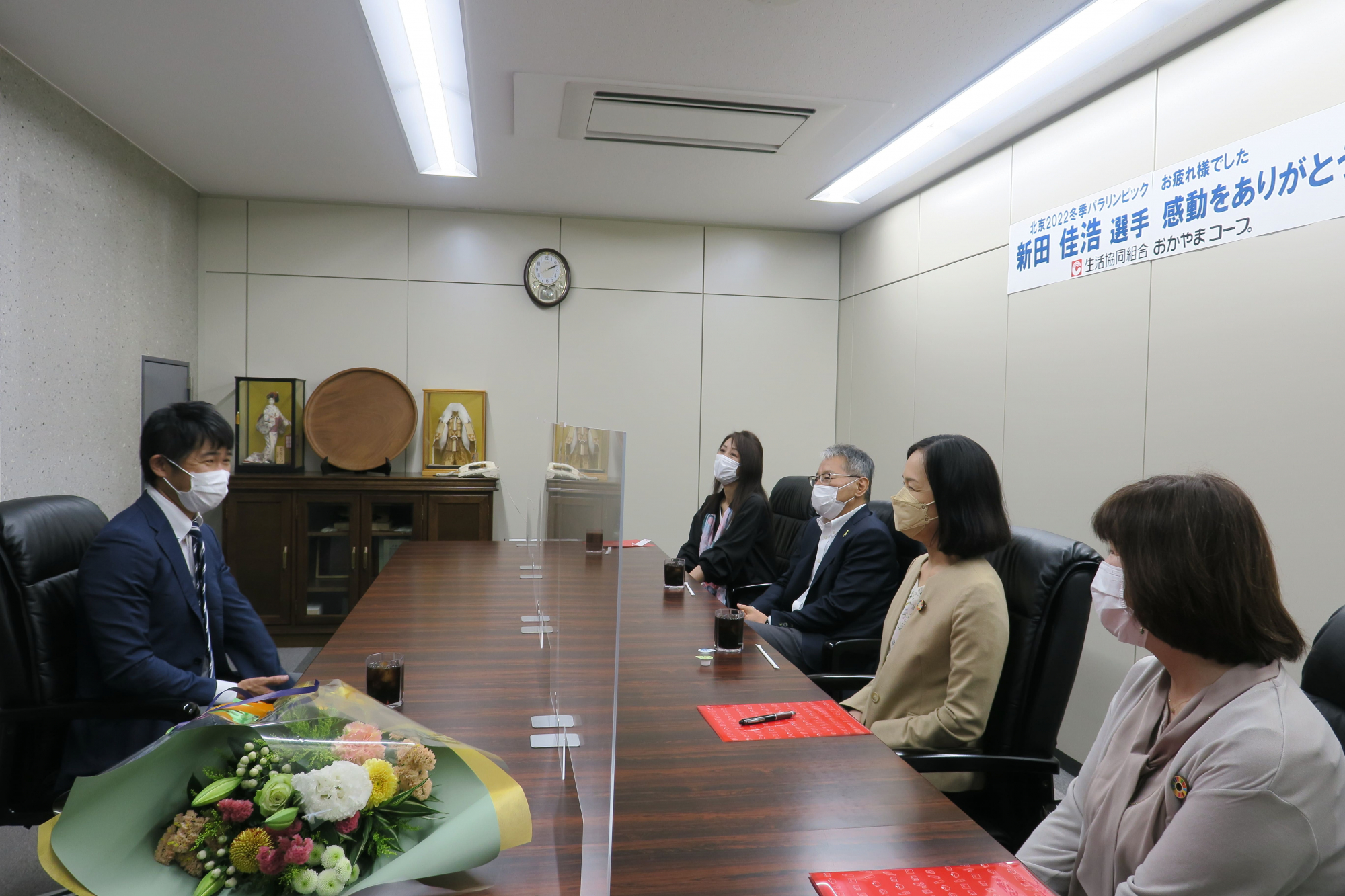 おかやまコープ組合員理事3名と平田昌三理事長が懇談し、新田選手から応援に対する謝意が伝えられました。