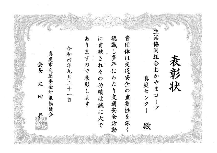 真庭市交通安全対策協議会からいただいた表彰状