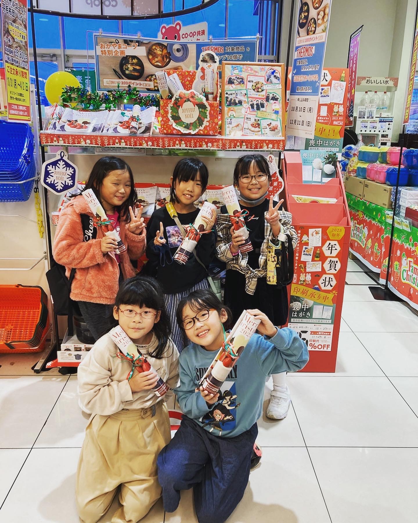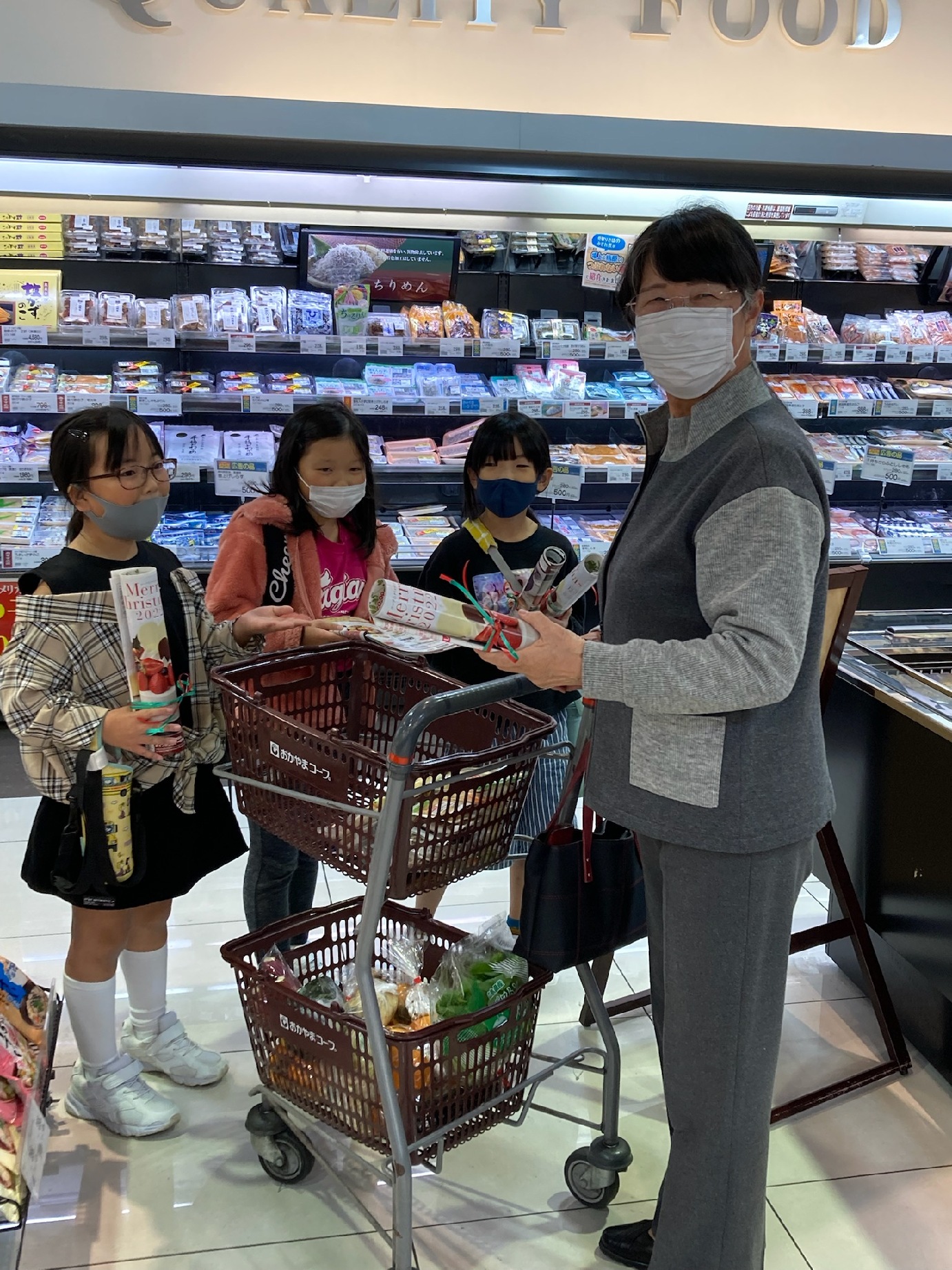 11月22日(火)には、A.M.I学童保育センターの小学生の小学生5名が、コープ大野辻でカタログを配布しました。こちらのケーキは、岡山県産の黒豆・ジャージー牛乳・シャインマスカットを使用した地産地消のタルトケーキで、地元のフレッシュタルトのお店「STYLE」さんで製造されます。