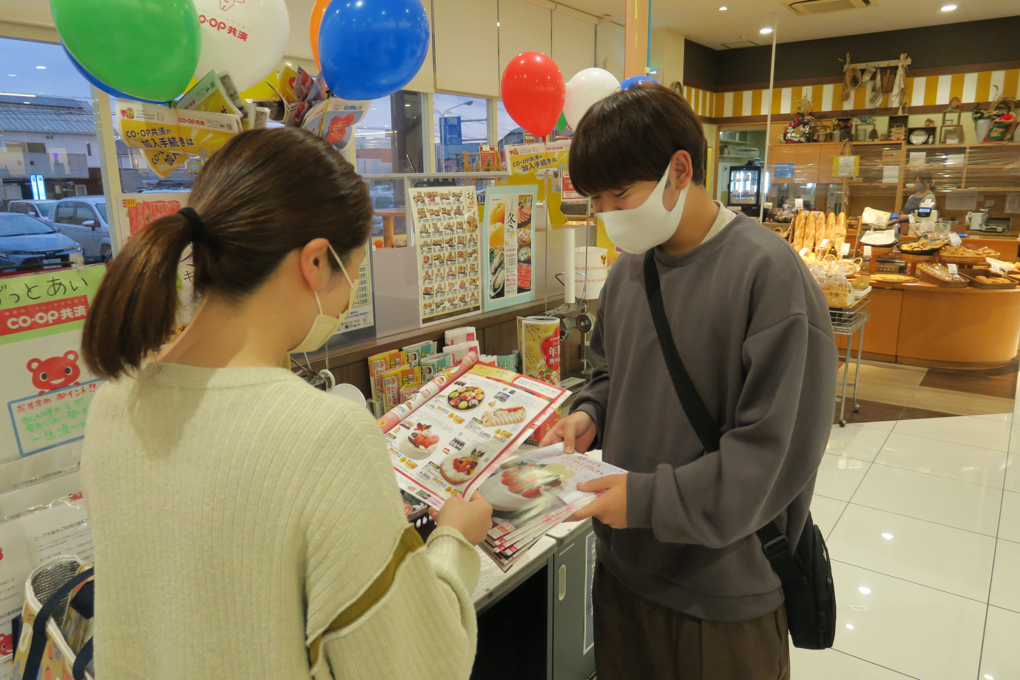 また、来店された組合員さんの中には「学生さんが頑張っている姿を見ると応援したくなります」、「フルーツがたっぷりで豪華。プレゼントしても喜ばれそう」などと話し、笑顔でカタログを持ち帰っていました。