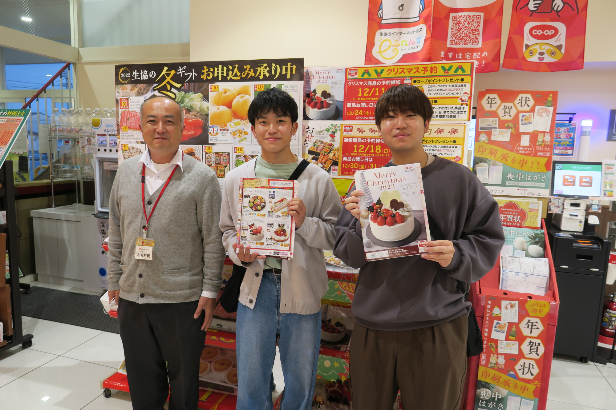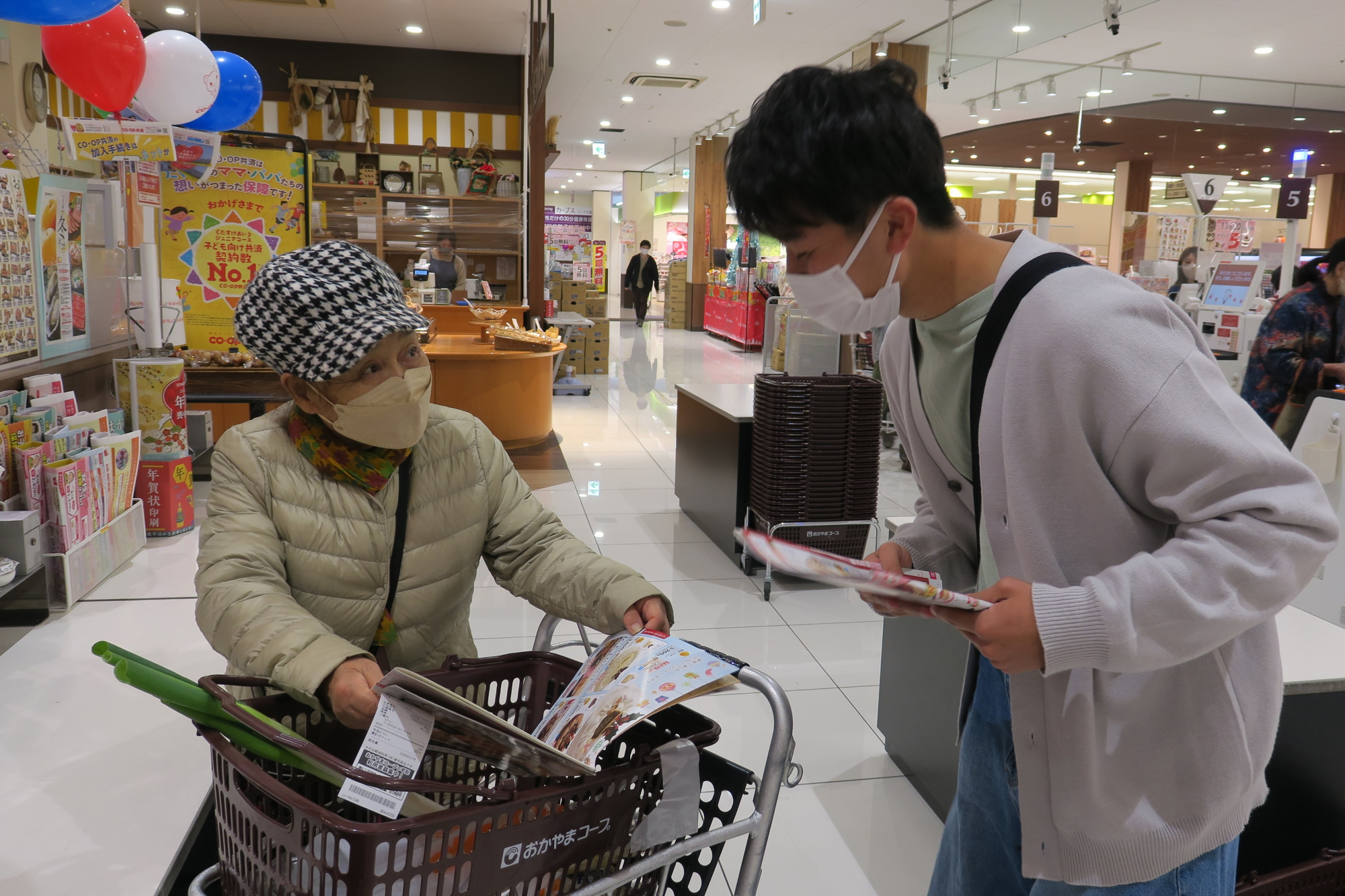 11月16日(水)、岡山大学の学生さんが、コープ大福に来店された組合員さんにカタログを配布し、ケーキをアピールしました。