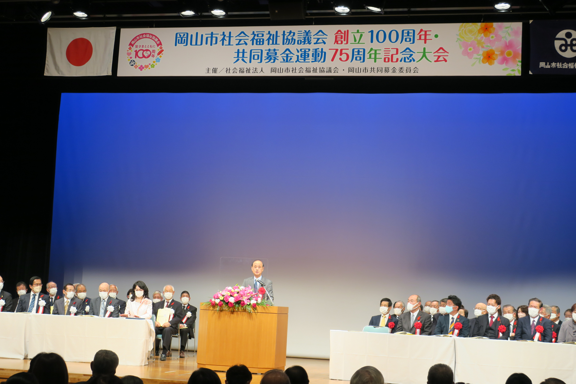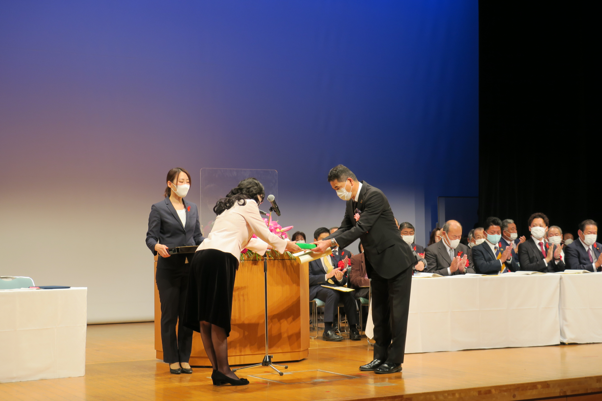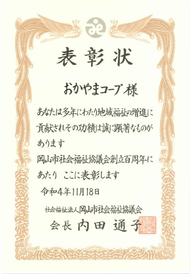 岡山市社協内田通子会長(左)より賞状を受け取る大同組織本部長