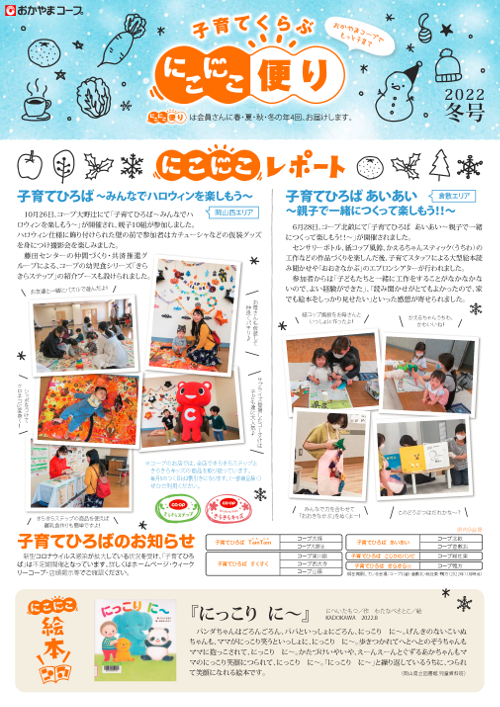 HOME 最新情報・お知らせ 「にこにこ便り」2022冬号を発行しました 最新情報・お知らせ 「にこにこ便り」2022冬号を発行しました 2022/12/16 子育てくらぶ「にこにこ便り」2022冬号を発行しました。 今回の「にこにこレポート」は、「みんなでハロウィンを楽しもう」(岡山西エリア 子育てひろば)、「親子で一緒につくって楽しもう!!」(倉敷エリア 子育てひろば あいあい)を紹介しています。 コープのお店のラック等にも置いてありますので、ぜひご覧ください。 ↓こちらをクリック↓ ⇒バックナンバーはこちらから お知らせ一覧に戻る
